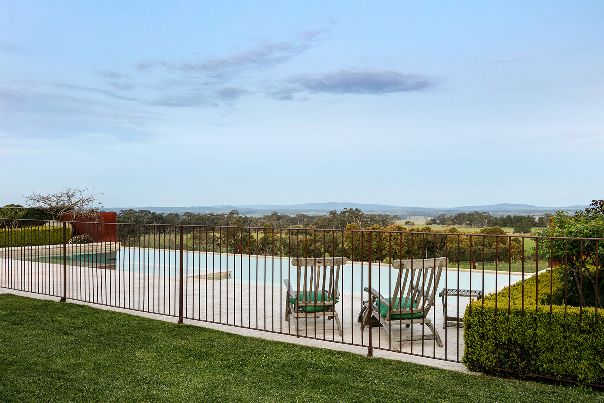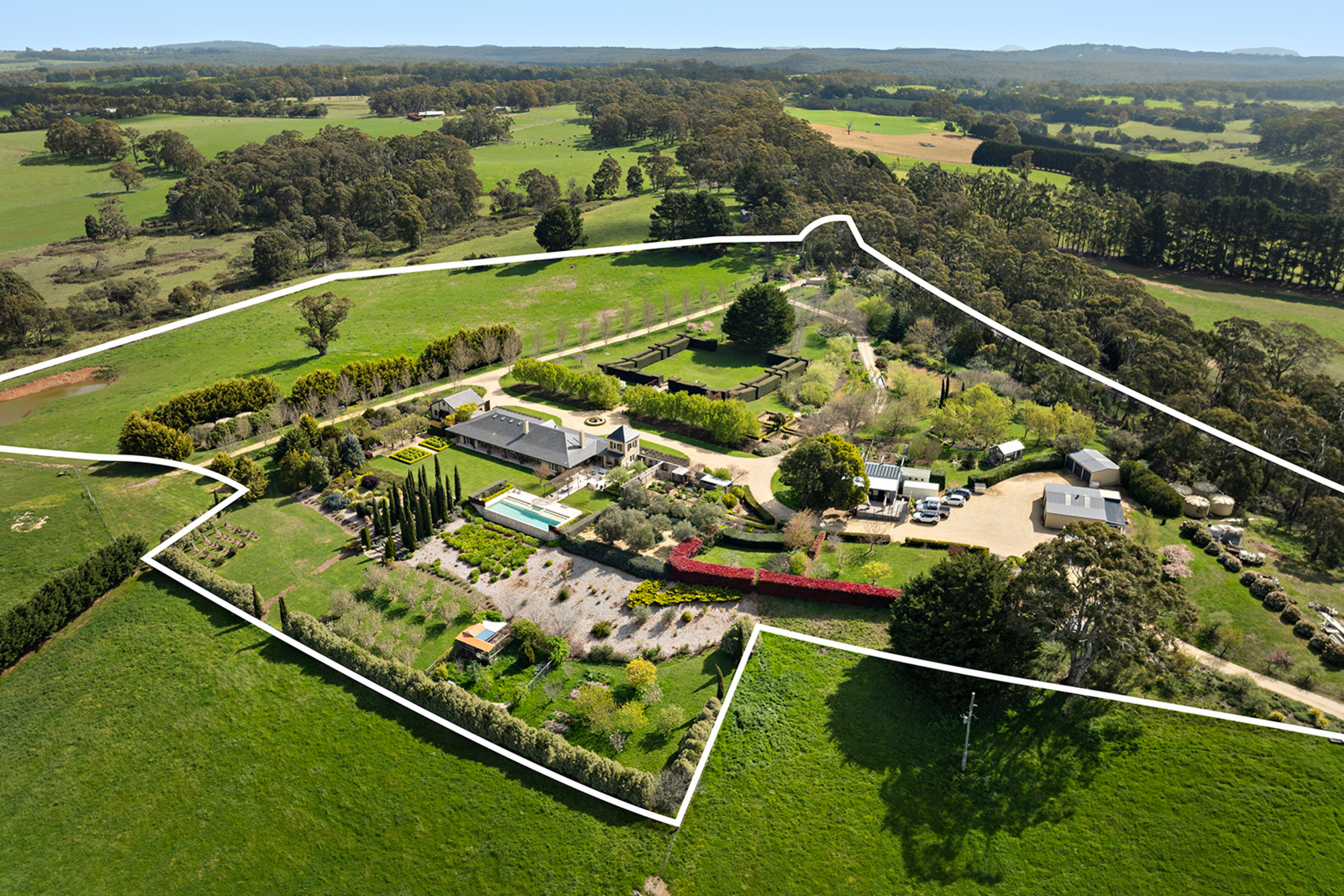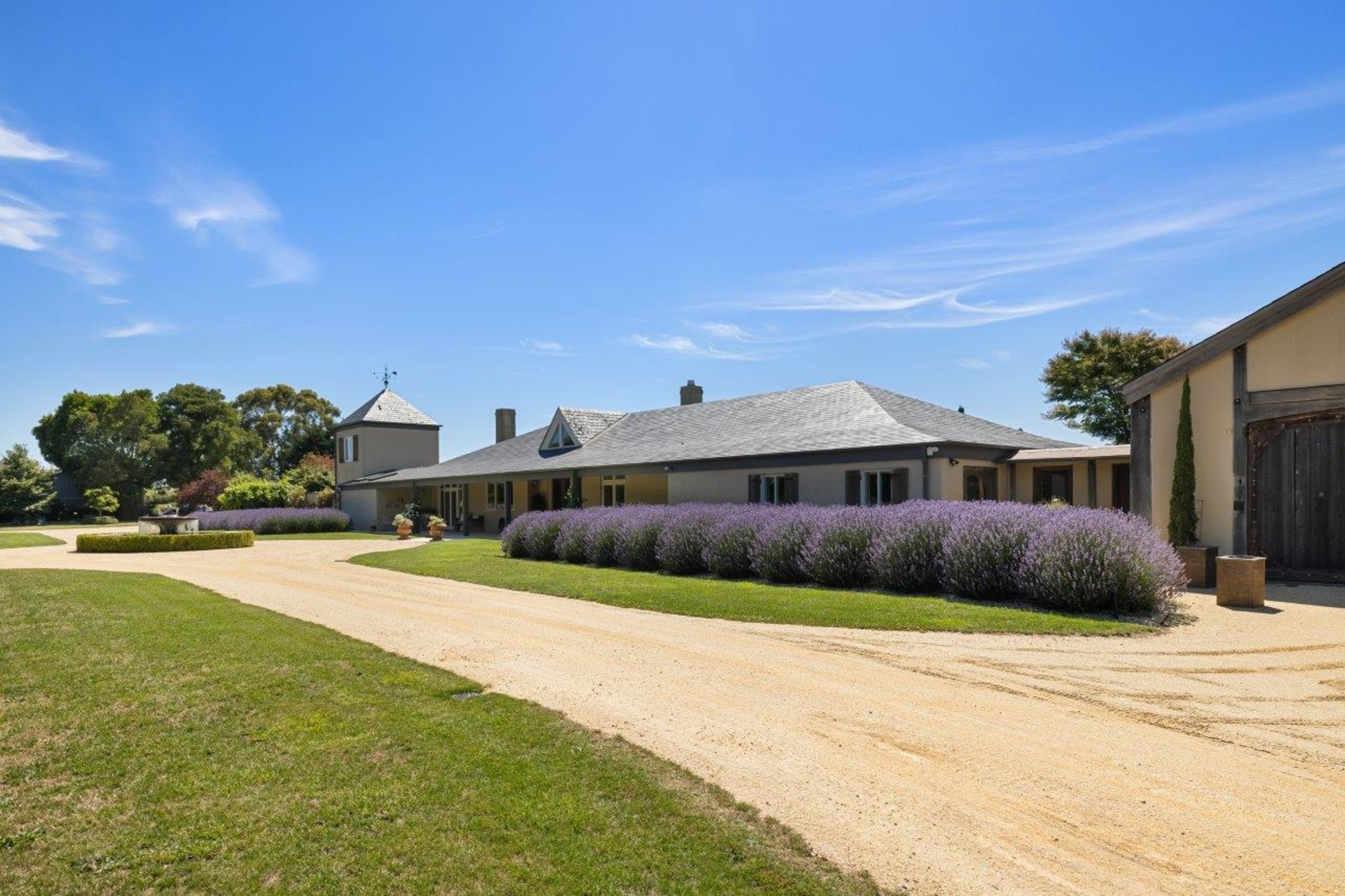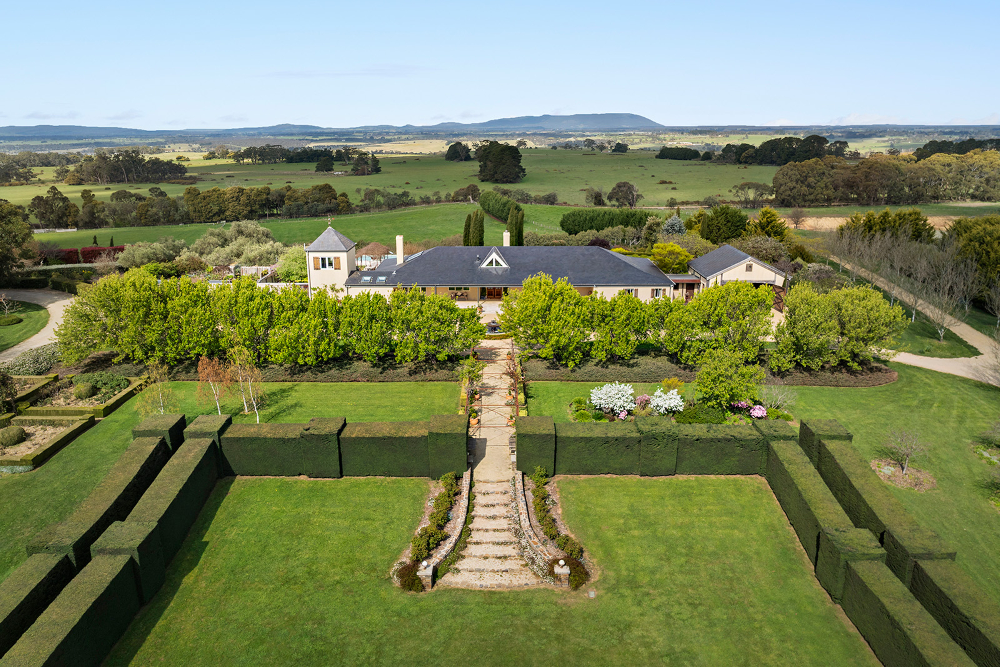 Magnificently nestled within one of the most beautiful garden settings in the region and commanding uninterrupted views to the Macedon Ranges, this stunning designer residence provides a unique rural lifestyle only 15 minutes to Kyneton, 20 minutes to Daylesford, and 55 minutes to the airport. Behind a charming fountain and vibrant beds of lavender, custom designed double doors reveal impressively proportioned living spaces featuring travertine floors, soaring timber lined ceilings and breathtaking views over the gardens to the ranges. Brilliantly designed for both relaxed family living and entertaining, the free-flowing living, sitting and dining areas with fireplaces (including one by Philippe Cheminee) at each end surround a country style gourmet kitchen with rustic timber table, stone benches and a 90cm Ilve oven. Multiple sets of French doors to the east, north and west extend the living areas out to the surrounding gardens including an undercover BBQ terrace, ornamental grapevine covered pergola and the picturesque, heated infinity pool and spa with the ranges as its backdrop. A superb accommodation wing comprises the glorious main bedroom featuring a travertine en suite with a view and lavish dressing room, a second bedroom with travertine en suite, two additional double bedrooms, a travertine bathroom and expansive media/billiards room with projector and screen. Upstairs there is an inviting sun-filled study or studio offering wonderful views. An internally accessed recycled timber-lined triple garage is the perfect party venue while a renovated shearer’s shed is now the ultimate entertainer’s zone complete with kitchenette, 4 bar fridges, a “whiskey lounge”, his and her toilets and large decks on both sides. Changing colour with the seasons, the spectacular gardens include a vast lawn surrounded by high manicured hedges, a Tuscan olive grove, rose gardens, citrus trees, a connecting dam with bridge, a walled vegetable/herb garden, large fragrant flowerbeds and a vast array of established oak, elm, pin-oak, pear, Cypress and pencil pine trees. An utterly serene and peaceful oasis behind secure remote gates and a long tree-lined return drive, this extraordinary property includes 2 machinery sheds, water tanks, an alarm, hydronic heating, powder-room, laundry with drying room, wine cellar, large storeroom, extensive irrigation, potting shed and fountain. Land size: 16 Acres (approx.)