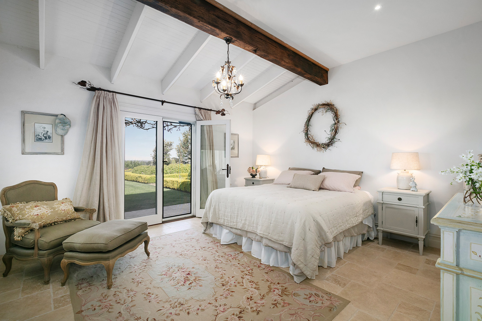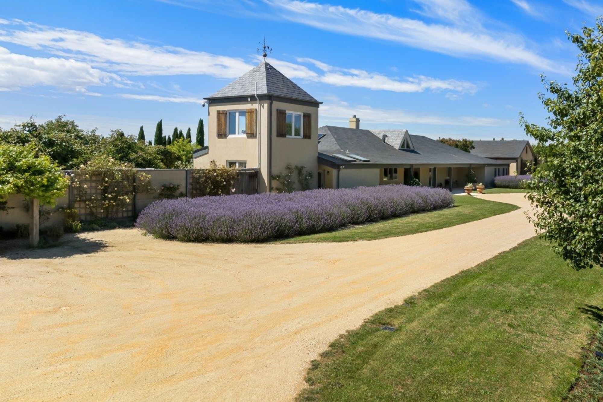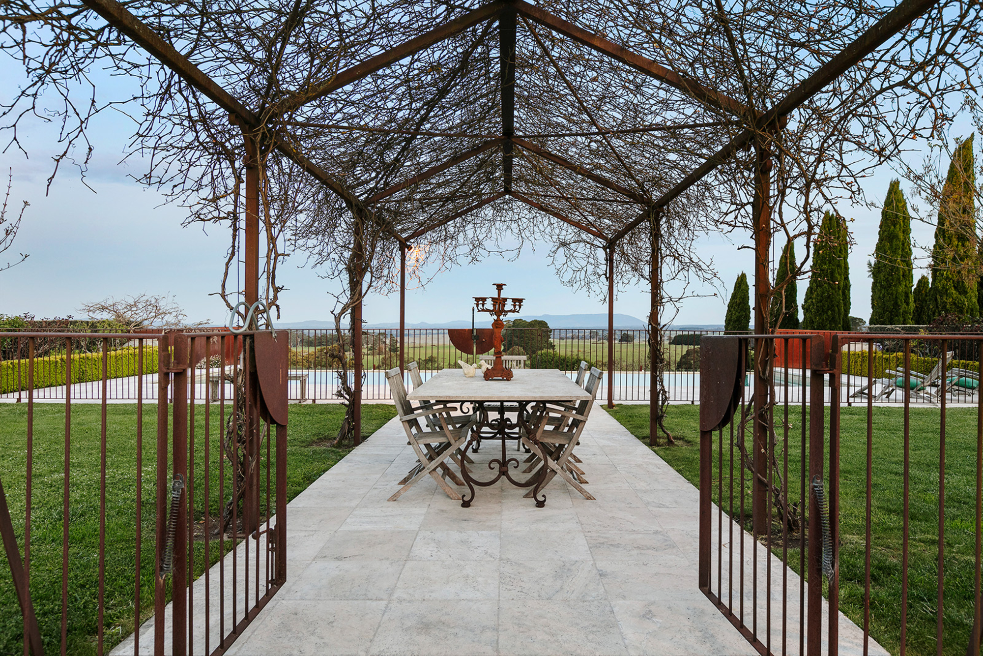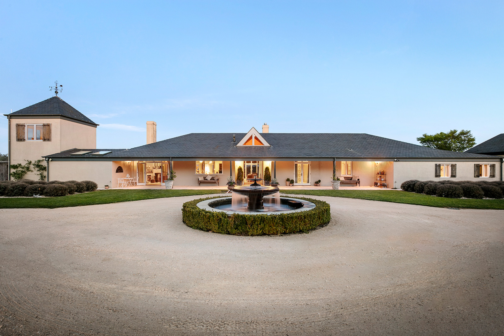 Magnificently nestled within one of the most beautiful garden settings in the region and commanding uninterrupted views to the Macedon Ranges, this stunning designer residence provides a unique rural lifestyle only 15 minutes to Kyneton, 20 minutes to Daylesford, and 55 minutes to the airport. Behind a charming fountain and vibrant beds of lavender, custom designed double doors reveal impressively proportioned living spaces featuring travertine floors, soaring timber lined ceilings and breathtaking views over the gardens to the ranges. Brilliantly designed for both relaxed family living and entertaining, the free-flowing living, sitting and dining areas with fireplaces (including one by Philippe Cheminee) at each end surround a country style gourmet kitchen with rustic timber table, stone benches and a 90cm Ilve oven. Multiple sets of French doors to the east, north and west extend the living areas out to the surrounding gardens including an undercover BBQ terrace, ornamental grapevine covered pergola and the picturesque, heated infinity pool and spa with the ranges as its backdrop. A superb accommodation wing comprises the glorious main bedroom featuring a travertine en suite with a view and lavish dressing room, a second bedroom with travertine en suite, two additional double bedrooms, a travertine bathroom and expansive media/billiards room with projector and screen. Upstairs there is an inviting sun-filled study or studio offering wonderful views. An internally accessed recycled timber-lined triple garage is the perfect party venue while a renovated shearer’s shed is now the ultimate entertainer’s zone complete with kitchenette, 4 bar fridges, a “whiskey lounge”, his and her toilets and large decks on both sides. Changing colour with the seasons, the spectacular gardens include a vast lawn surrounded by high manicured hedges, a Tuscan olive grove, rose gardens, citrus trees, a connecting dam with bridge, a walled vegetable/herb garden, large fragrant flowerbeds and a vast array of established oak, elm, pin-oak, pear, Cypress and pencil pine trees. An utterly serene and peaceful oasis behind secure remote gates and a long tree-lined return drive, this extraordinary property includes 2 machinery sheds, water tanks, an alarm, hydronic heating, powder-room, laundry with drying room, wine cellar, large storeroom, extensive irrigation, potting shed and fountain. Land size: 16 Acres (approx.)