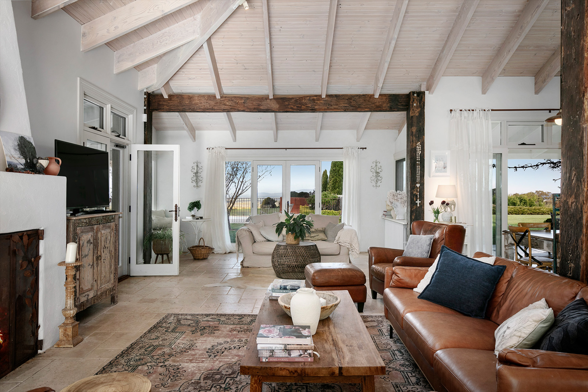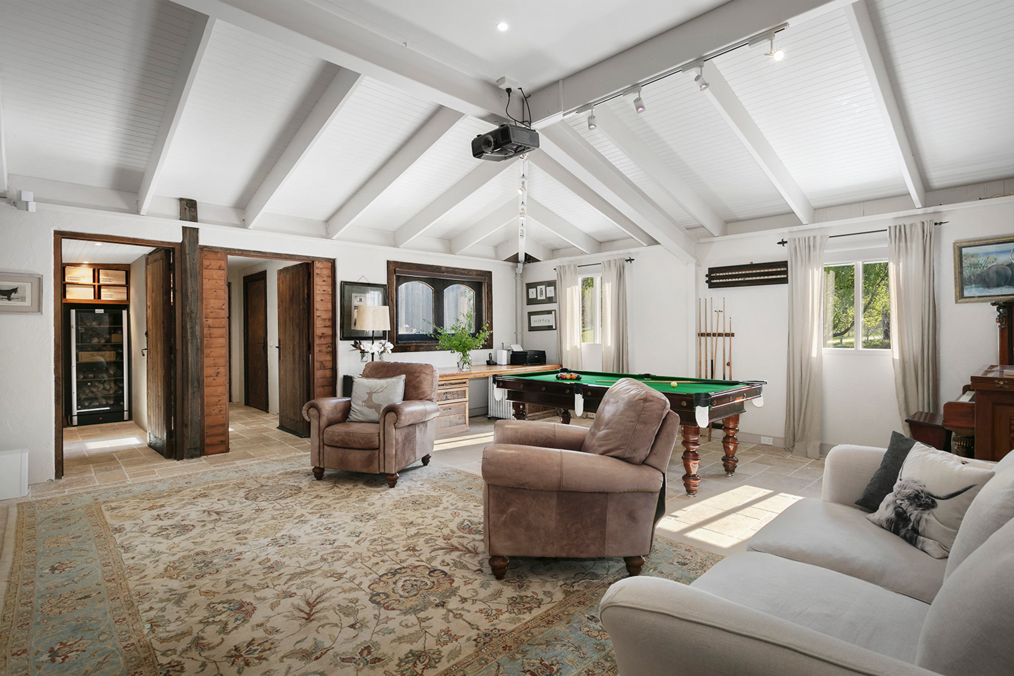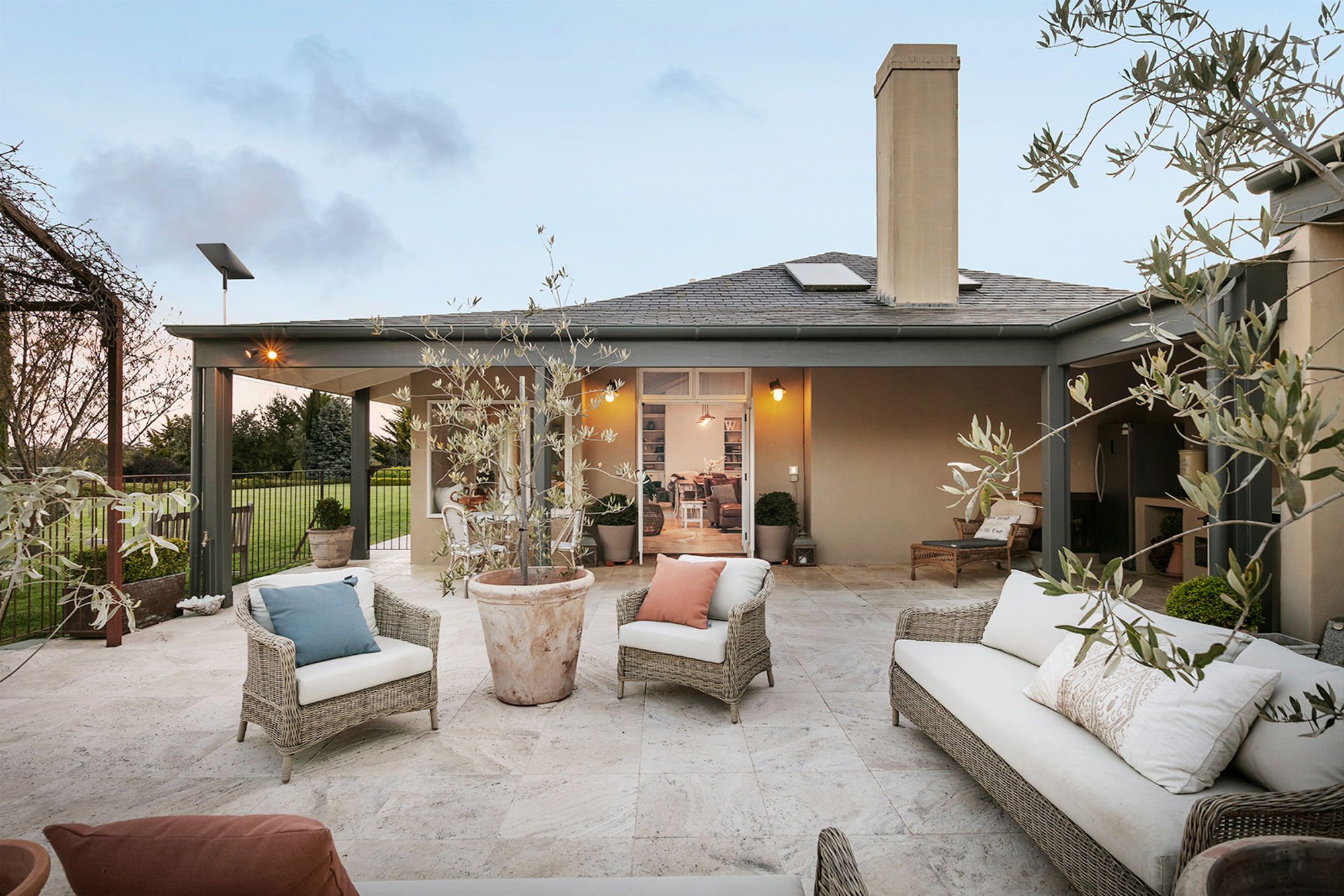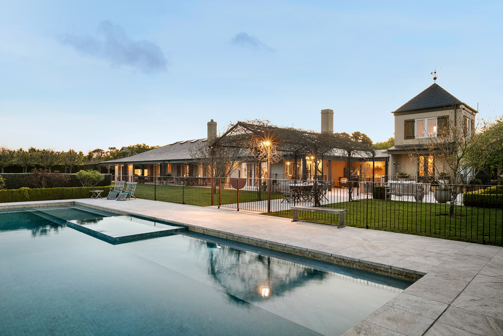 Magnificently nestled within one of the most beautiful garden settings in the region and commanding uninterrupted views to the Macedon Ranges, this stunning designer residence provides a unique rural lifestyle only 15 minutes to Kyneton, 20 minutes to Daylesford, and 55 minutes to the airport. Behind a charming fountain and vibrant beds of lavender, custom designed double doors reveal impressively proportioned living spaces featuring travertine floors, soaring timber lined ceilings and breathtaking views over the gardens to the ranges. Brilliantly designed for both relaxed family living and entertaining, the free-flowing living, sitting and dining areas with fireplaces (including one by Philippe Cheminee) at each end surround a country style gourmet kitchen with rustic timber table, stone benches and a 90cm Ilve oven. Multiple sets of French doors to the east, north and west extend the living areas out to the surrounding gardens including an undercover BBQ terrace, ornamental grapevine covered pergola and the picturesque, heated infinity pool and spa with the ranges as its backdrop. A superb accommodation wing comprises the glorious main bedroom featuring a travertine en suite with a view and lavish dressing room, a second bedroom with travertine en suite, two additional double bedrooms, a travertine bathroom and expansive media/billiards room with projector and screen. Upstairs there is an inviting sun-filled study or studio offering wonderful views. An internally accessed recycled timber-lined triple garage is the perfect party venue while a renovated shearer’s shed is now the ultimate entertainer’s zone complete with kitchenette, 4 bar fridges, a “whiskey lounge”, his and her toilets and large decks on both sides. Changing colour with the seasons, the spectacular gardens include a vast lawn surrounded by high manicured hedges, a Tuscan olive grove, rose gardens, citrus trees, a connecting dam with bridge, a walled vegetable/herb garden, large fragrant flowerbeds and a vast array of established oak, elm, pin-oak, pear, Cypress and pencil pine trees. An utterly serene and peaceful oasis behind secure remote gates and a long tree-lined return drive, this extraordinary property includes 2 machinery sheds, water tanks, an alarm, hydronic heating, powder-room, laundry with drying room, wine cellar, large storeroom, extensive irrigation, potting shed and fountain. Land size: 16 Acres (approx.)