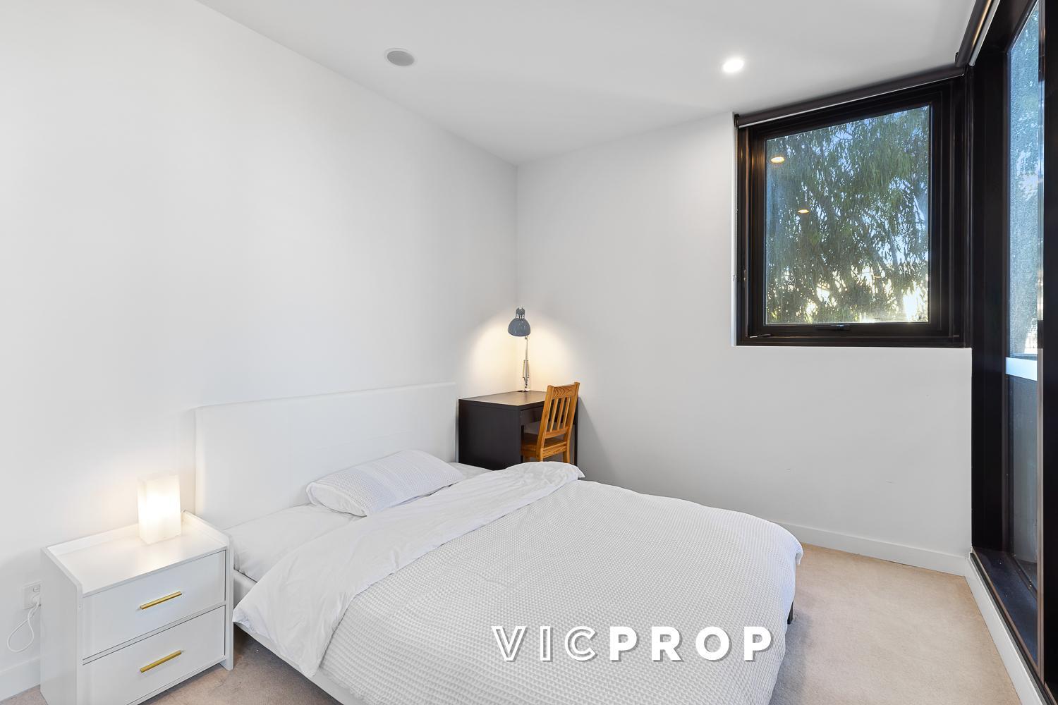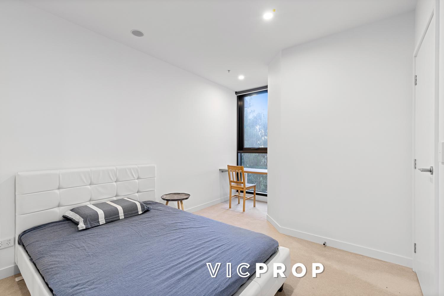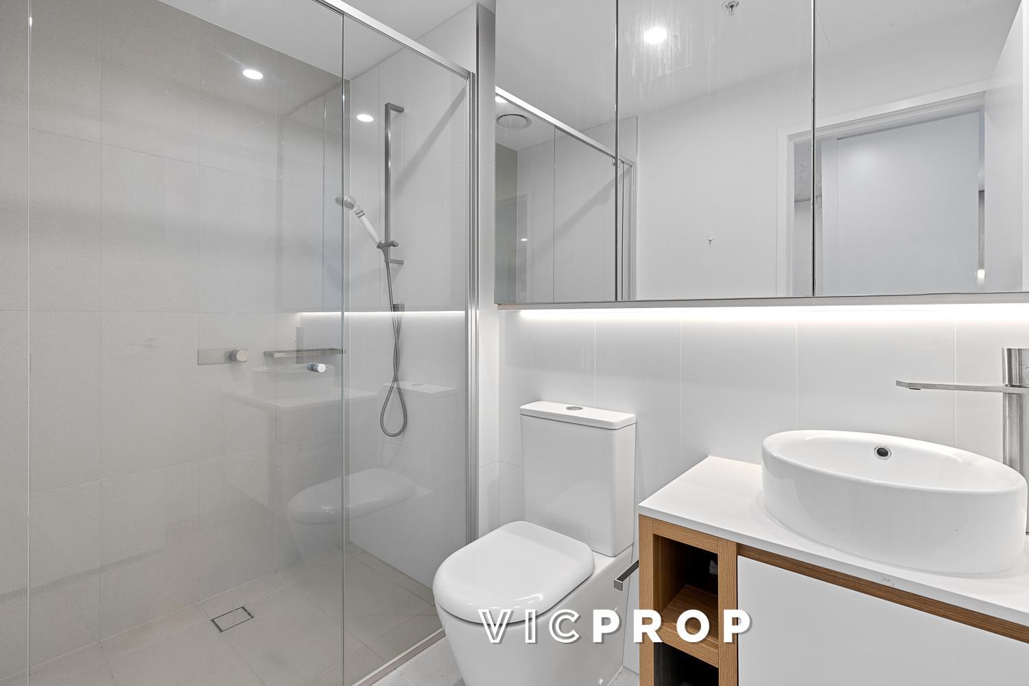 The apartment is boosted by the addition of a roomy study zone and a handy bedroom study nook, both with built-in desks. Flawlessly fitted and finished, the pair of generously sized bedrooms are naturally lit and mirror-robed, each serviced by luxe bathrooms featuring floor-to-ceiling tiles and mirrored cabinetry.