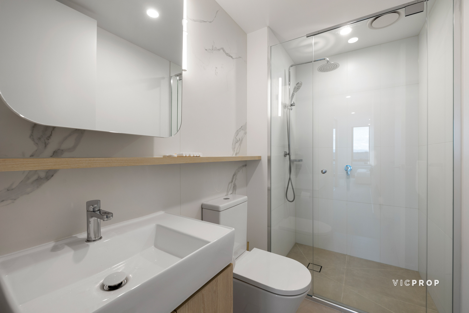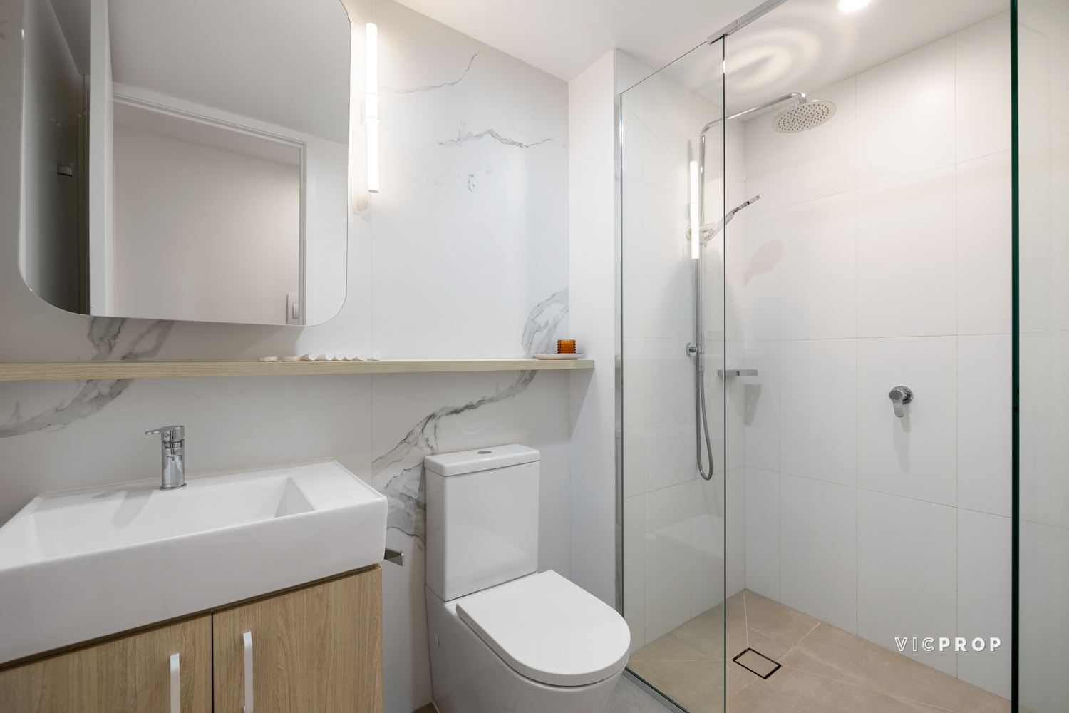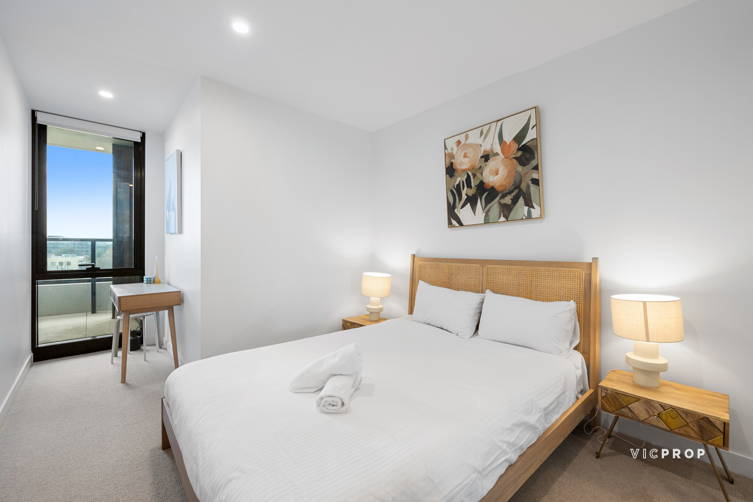 Two-bedroom accommodation comprises a primary bedroom with BIR and ensuite joined by a secondary bedroom with BIR and main bathroom. Both bathrooms feature floor-to-ceiling tiling and rainfall showers.