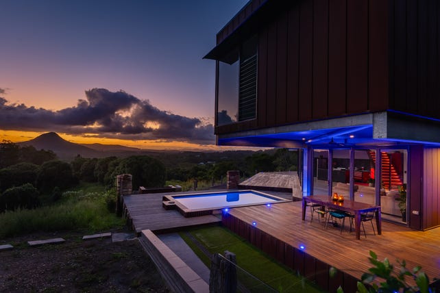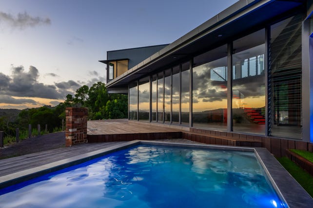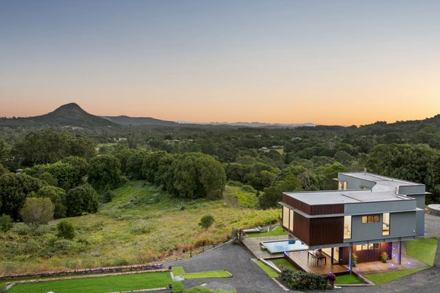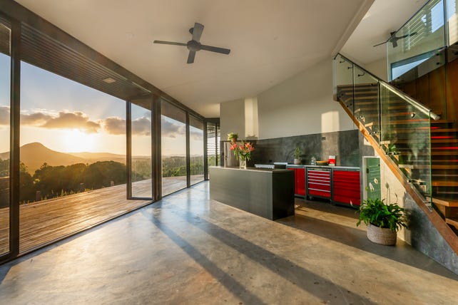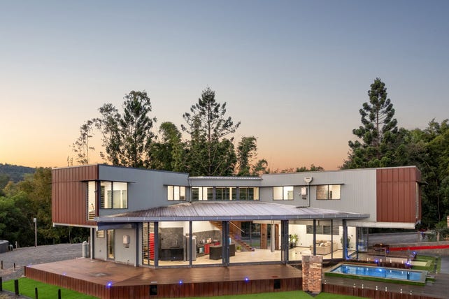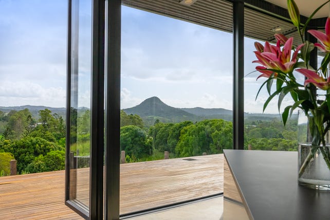 Escape to 123 Arthys Road, Cooran, where contemporary style meets peaceful country living. This striking two-storey steel-framed home is set on 16.65 acres of undulating land, offering breathtaking views over Mt Cooroora and Mt Cooran. Designed to maximise light and space, the home features polished concrete floors, blackbutt timber finishes, and expansive glass windows that capture the scenery from every angle.