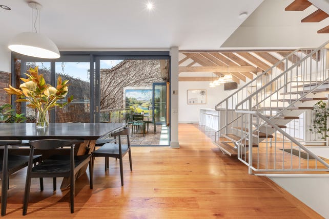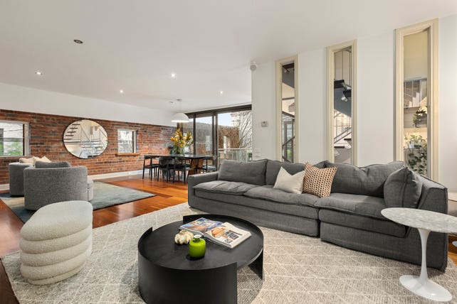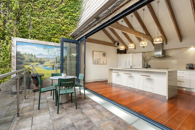 Celebrating the iconic Malt House’s rich industrial history, this brilliant architectural conversion delivers a breathtaking inner urban family domain spanning four stylish, light-filled and impressively proportioned levels. Beyond the vine covered original brick walls, an evocative private forecourt is the perfect oasis for a morning coffee or evening drinks. Exposed brick walls, timber floors and soaring raftered ceilings highlight the rich character through the expansive living and dining room and the stunning gourmet kitchen appointed with stone benches, 90cm Smeg oven and integrated Liebherr fridge/freezer.