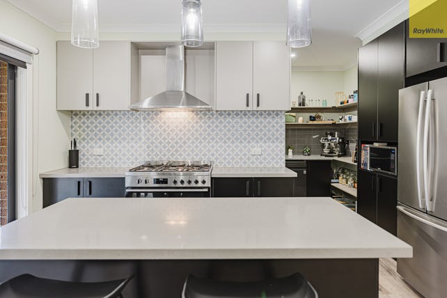 The kitchen is a true highlight, showcasing sleek black tapware and quality stainless steel appliances including a 900mm oven, cooktop and dishwasher. The 40mm stone benchtops and large island bench provide ample preparation space, while a spacious walk-in pantry ensures plenty of storage.