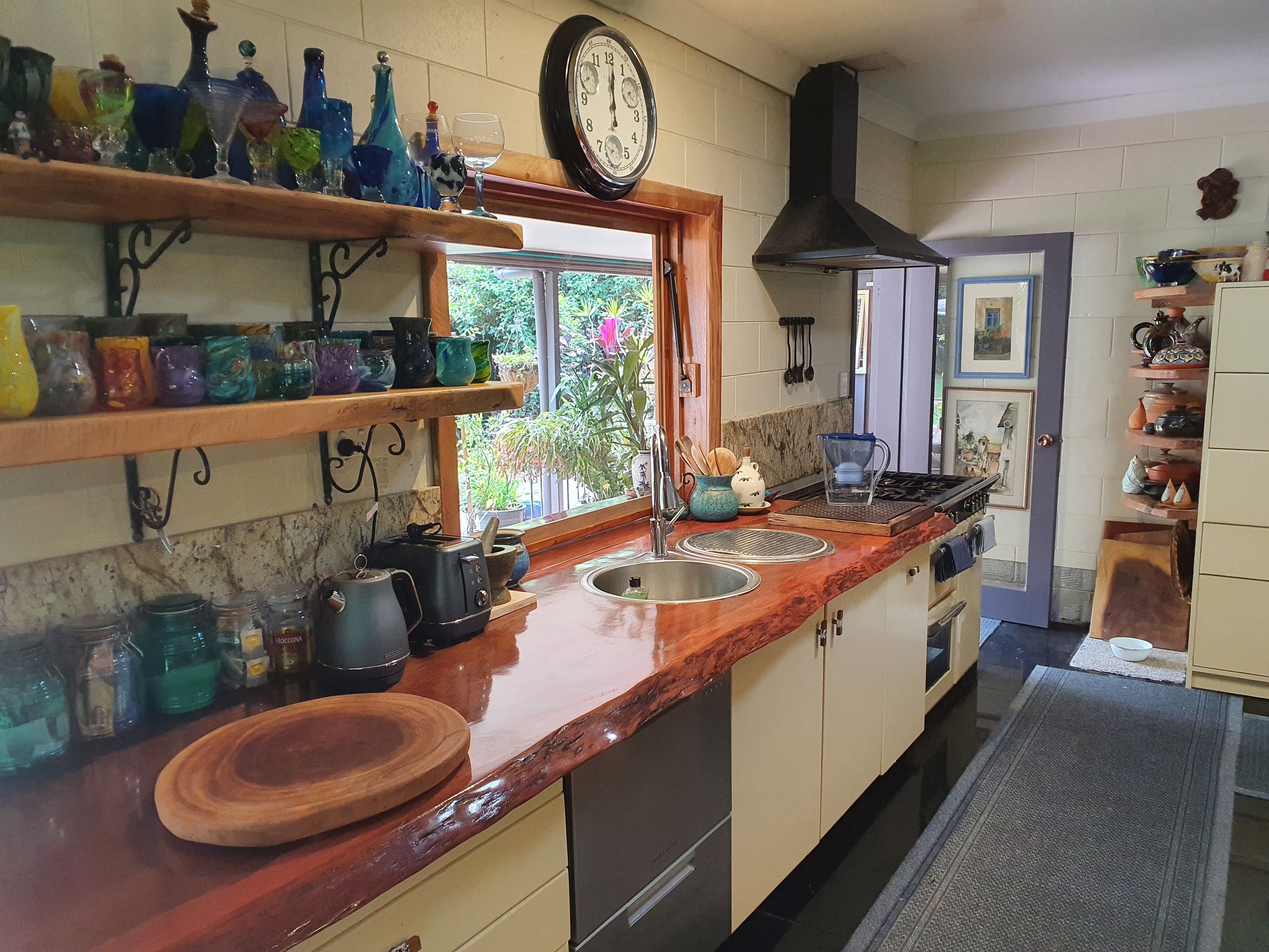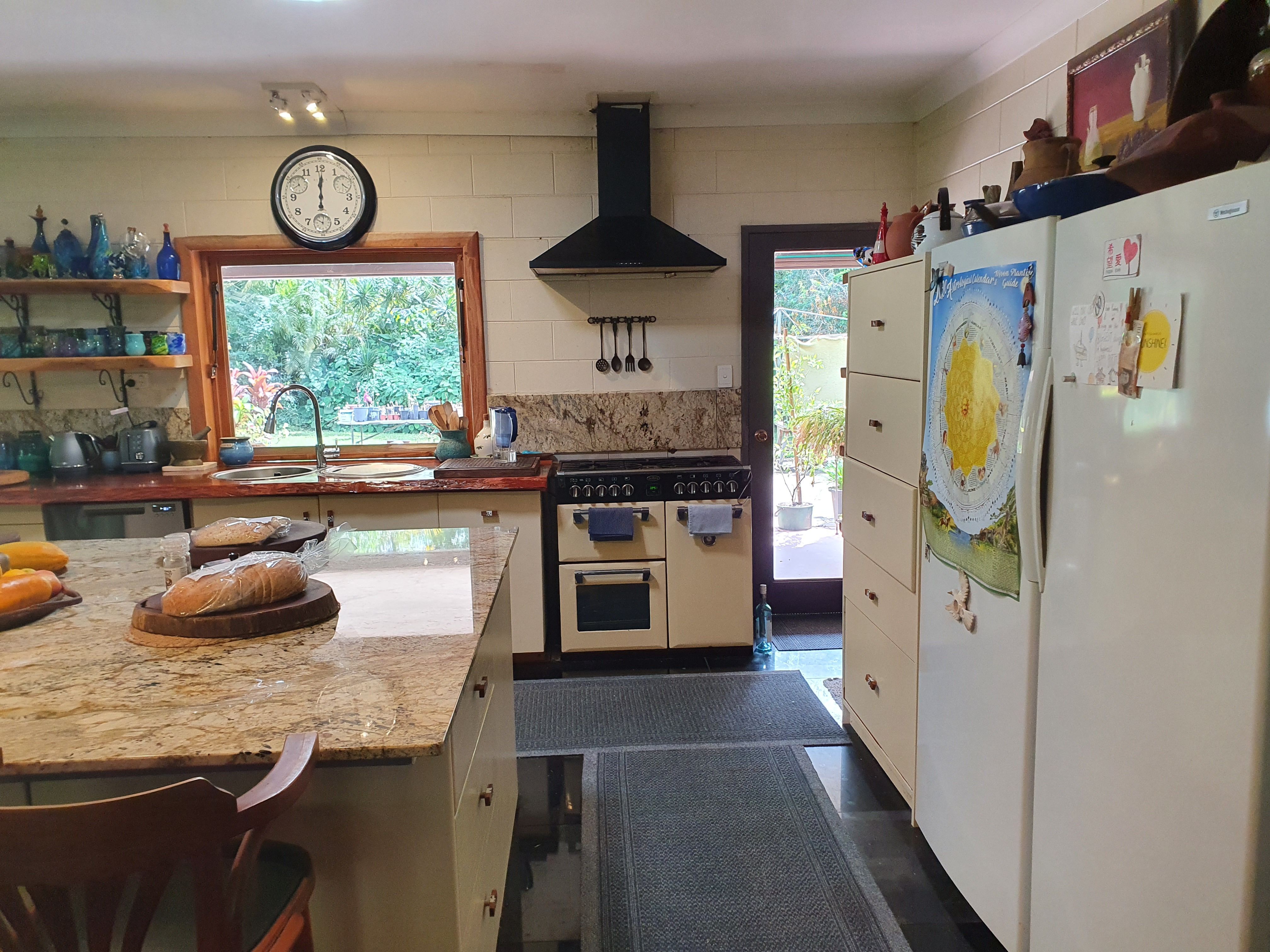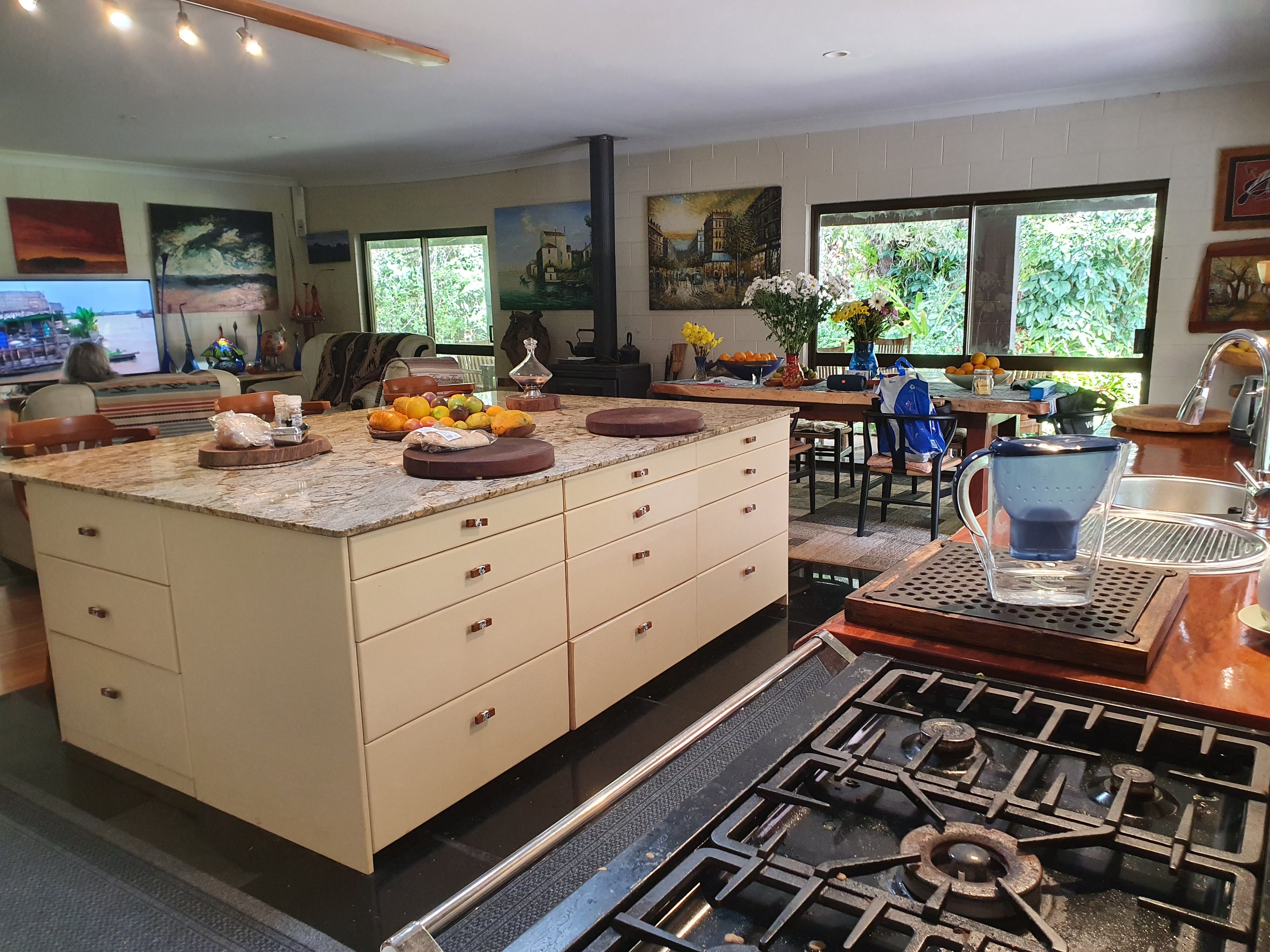 Large utility/laundry room and a large walk-in pantry. Custom built solid timber kitchen with granite island, awning window onto the verandah, twin Oliveri round sinks, Belling gas/electric range and granite tiles. Open plan living area with combustion wood stove.