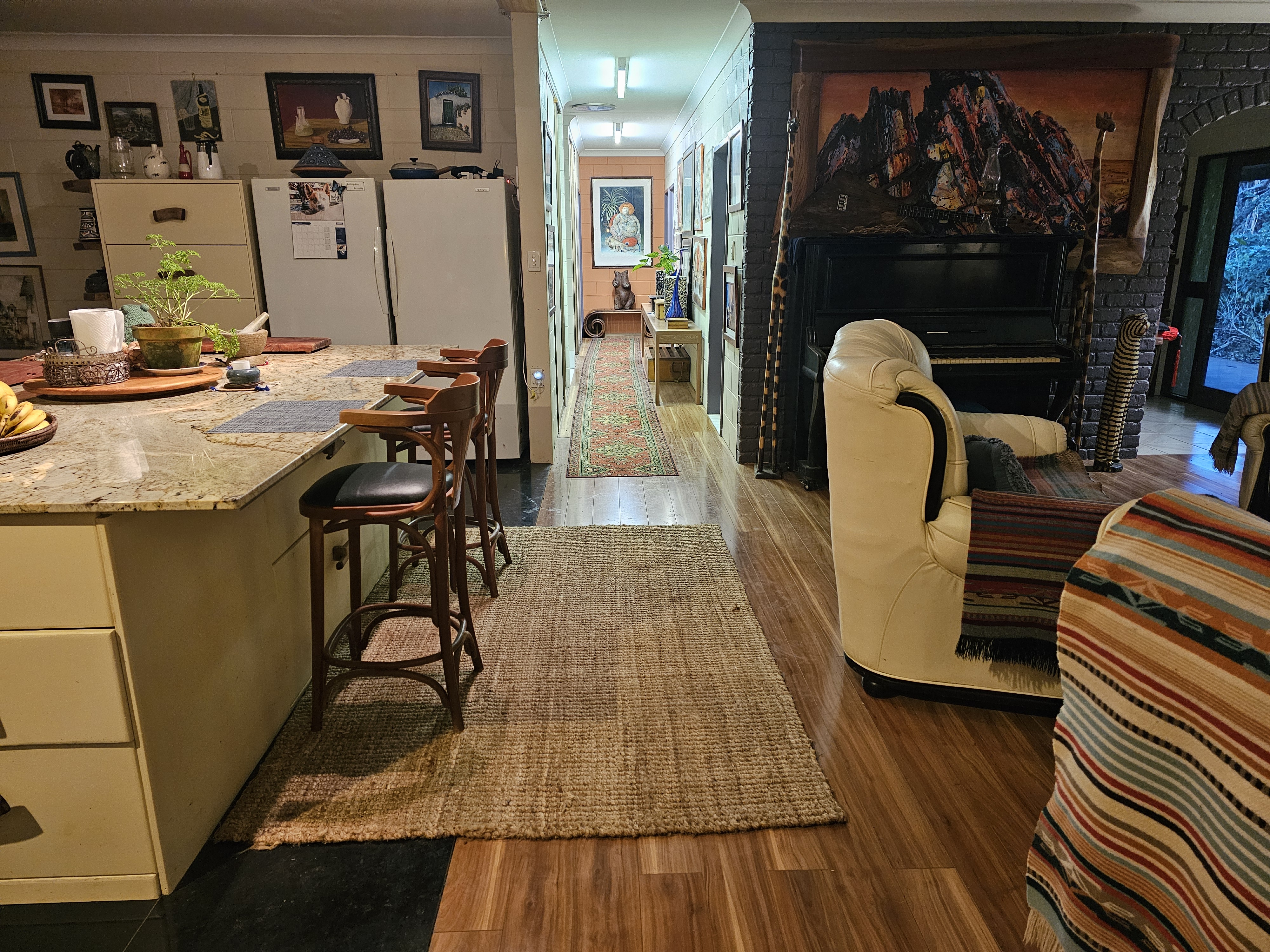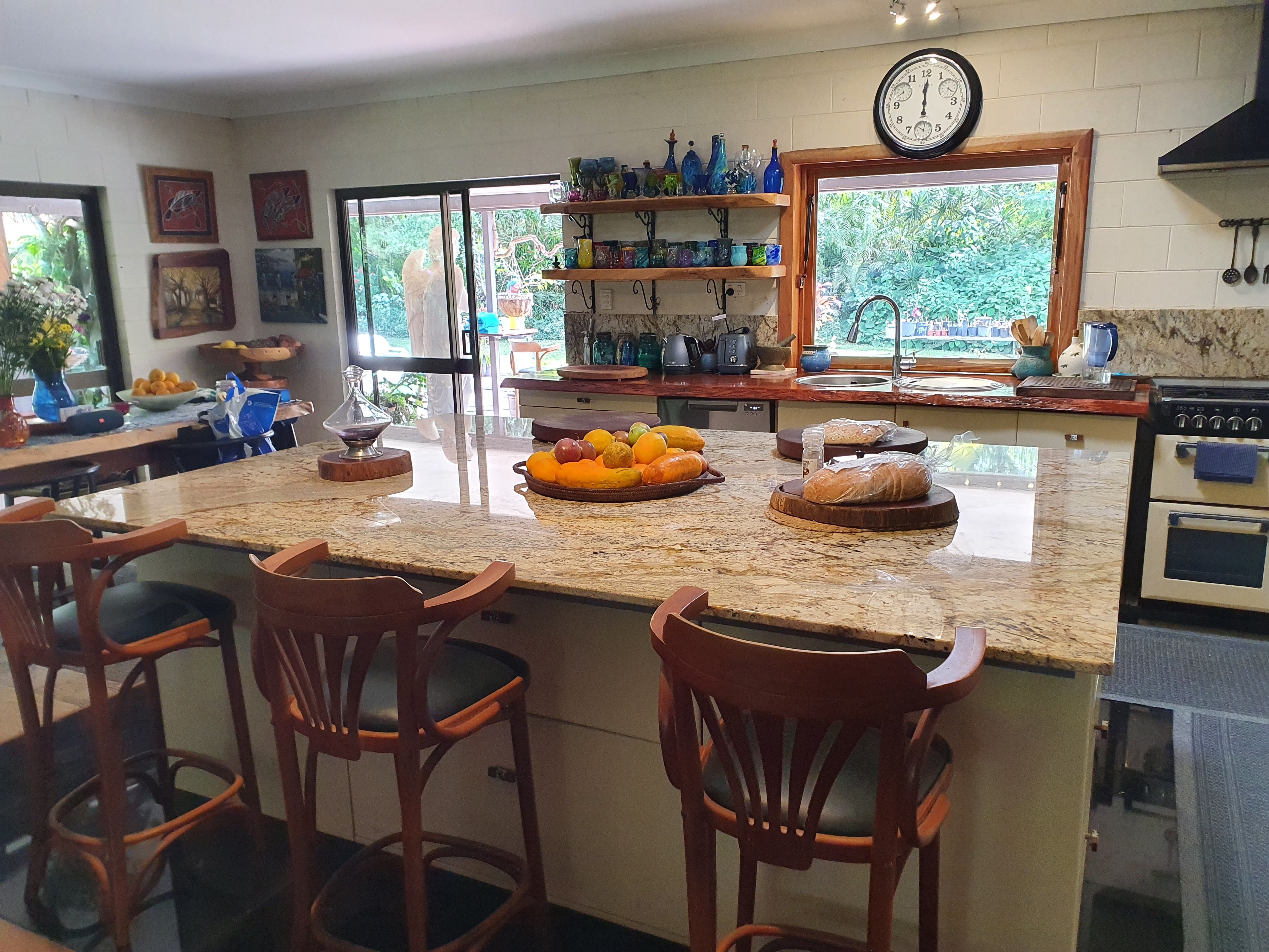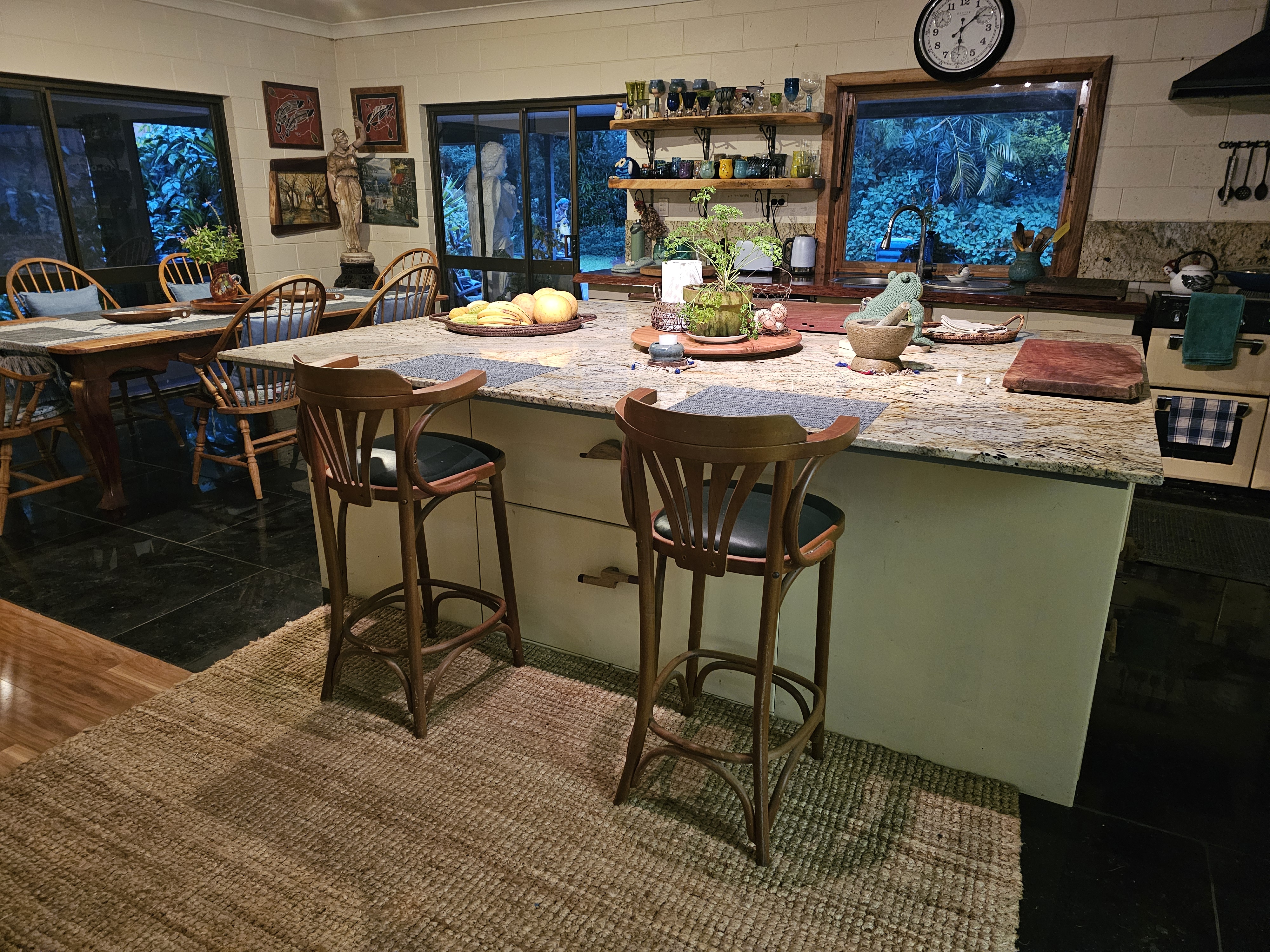 Large utility/laundry room and a large walk-in pantry. Custom built solid timber kitchen with granite island, awning window onto the verandah, twin Oliveri round sinks, Belling gas/electric range and granite tiles. Open plan living area with combustion wood stove.