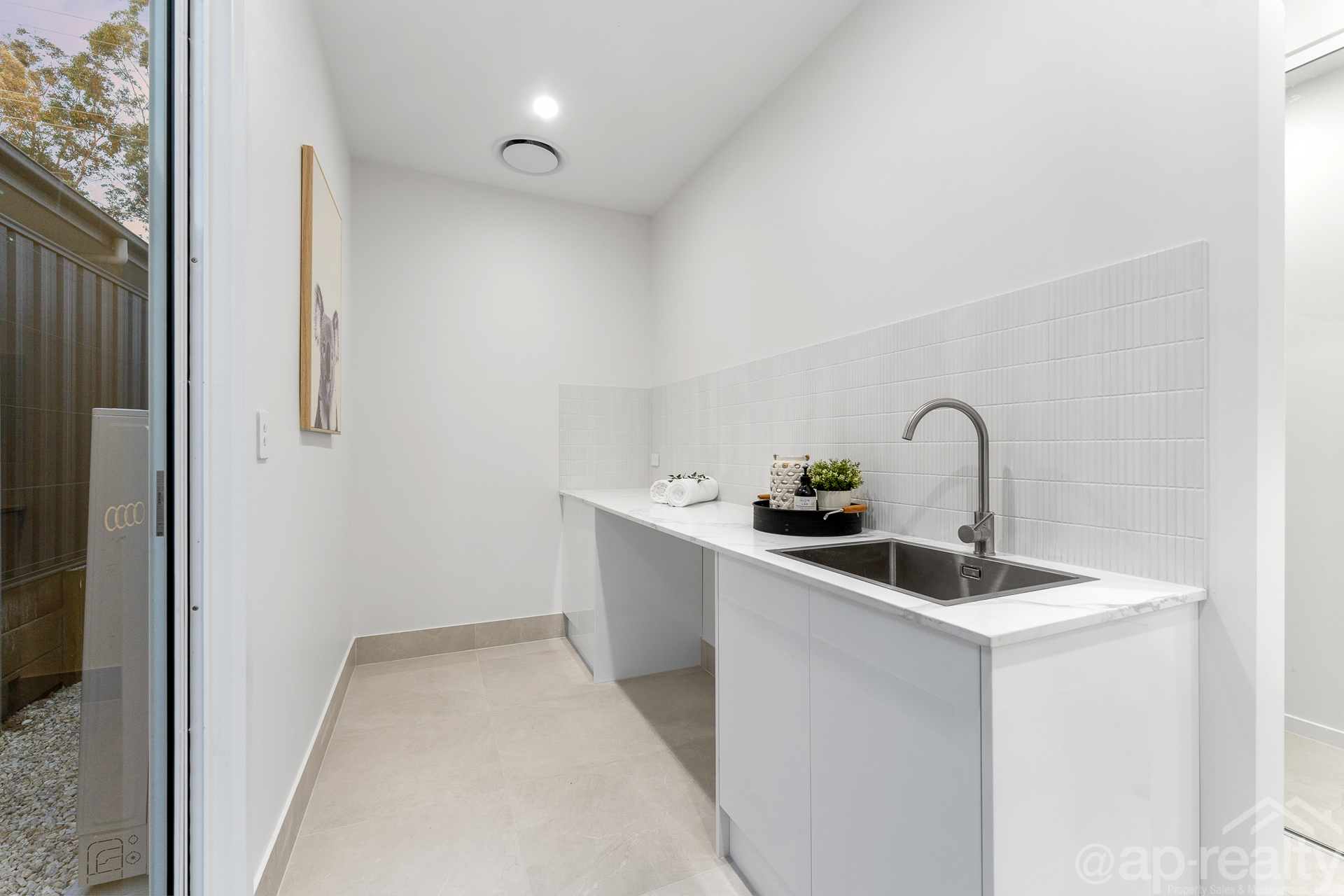 A set of elegant sliding doors opens to a spacious, tiled void patio with more than 5 metre ceiling height, perfect for sophisticated alfresco entertaining. Adorned with downlights, a ceiling fan, and hanging two egg chairs, this area overlooks a flawlessly landscaped, low-maintenance backyard, ideal for both intimate gatherings and grand celebrations. The remote-control double garage with internal access provides secure parking and additional storage space in garage, Also motored roller door to access to backyard.