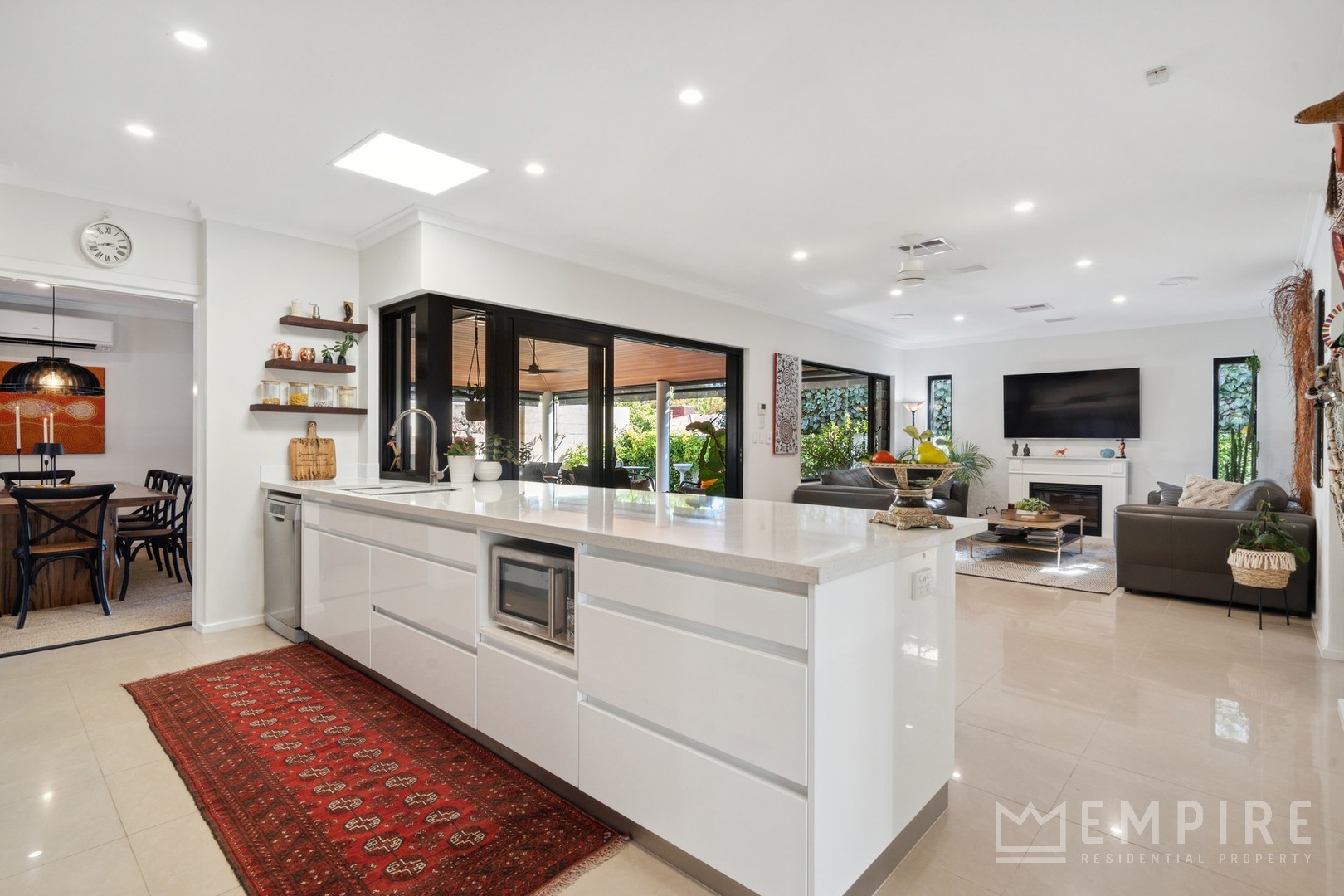 • Open plan kitchen/living/meals with ceiling fan with stacker doors to alfresco area • Stunning kitchen with SMEG freestanding 5x induction cooktop, large oven, tiled splashback, integrated rangehood, fridge recess, large double pantry, polished stone benchtops, dishwasher, dual sink, microwave recess, breakfast bar, plenty of bench and cupboard space with extra overhead cabinetry