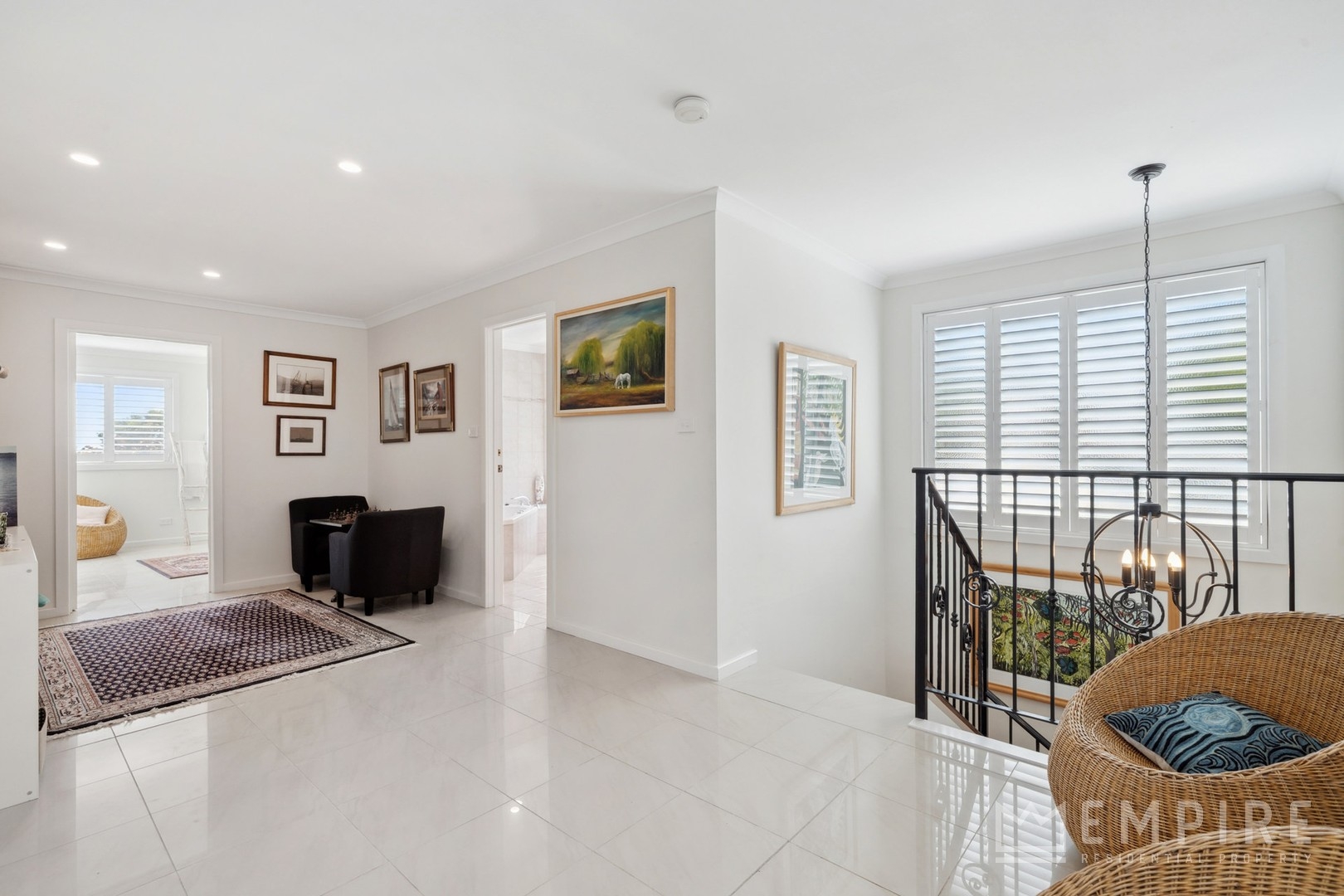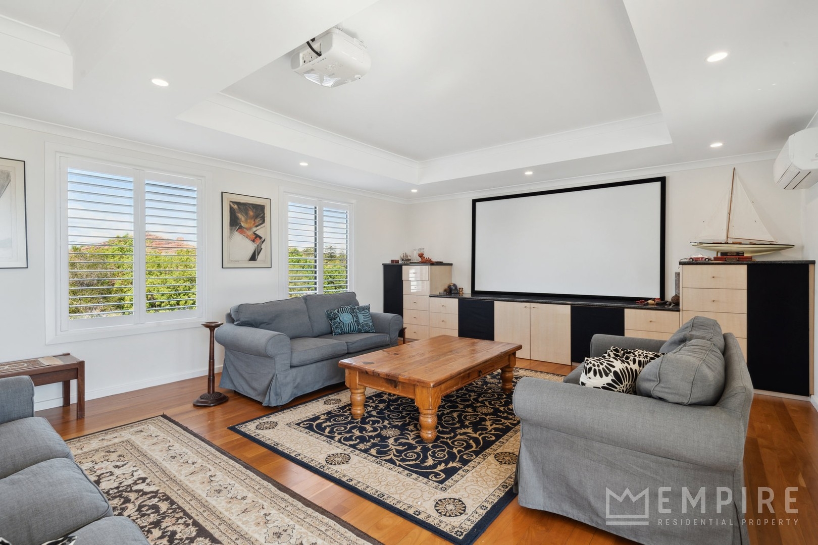 • Large upstairs theatre room with projector, louvre shutters and built-in bar, opening up to large balcony offering views over the Indian Ocean – perfect for relaxing and watching the sunsets every night • Upstairs landing activity area with access to second balcony • Spacious ground floor king size master bedroom offers louvre shutters, ceiling fan, built in robes and ensuite with shower, single vanity with storage, heat lamps, access to private alfresco area and WC - all tiled from floor to ceiling