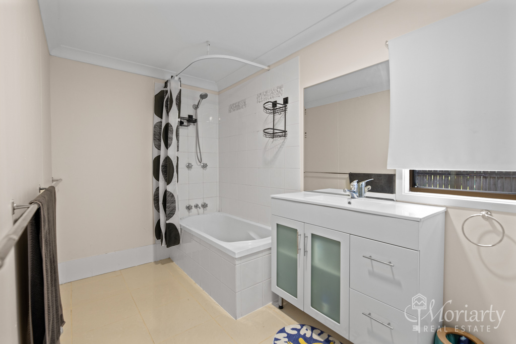 downstairs ** 2 bathrooms, 1 with shower over bath ** 3rd toilet downstairs ** Large back deck ** Small front deck ** Large fully-fenced yard ** Side access with caravan-weighted concrete drive to large shed ** Raised veggie gardens & established fruit trees ** Water tanks for gardens ** 6m x 9m shed with workshop and small garden shed ** Solar power
