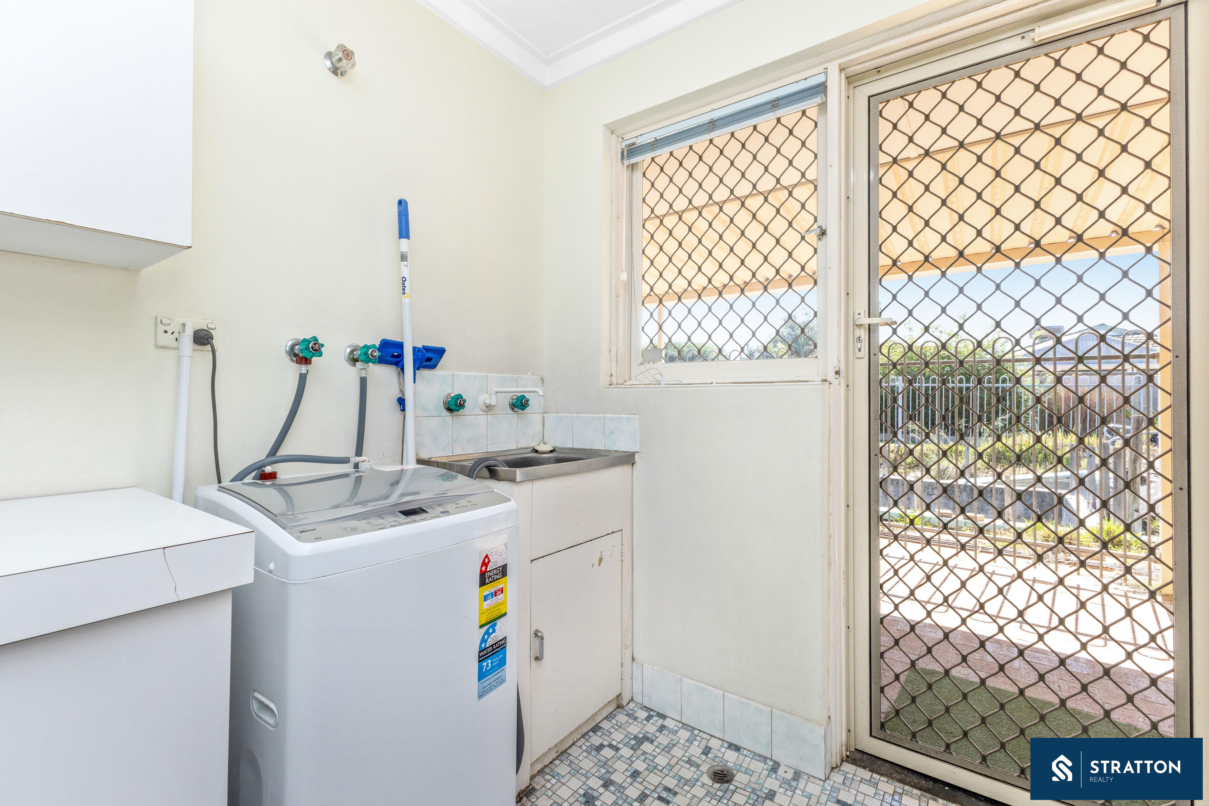 All three bedrooms are of decent size, featuring carpet flooring and built-in robes, with the main bedroom offering additional storage. The bathroom includes a shower, bathtub, and heat lamp, while a separate toilet adds extra convenience. A built-in closet and a functional laundry area with cupboards and backyard access complete the interior.