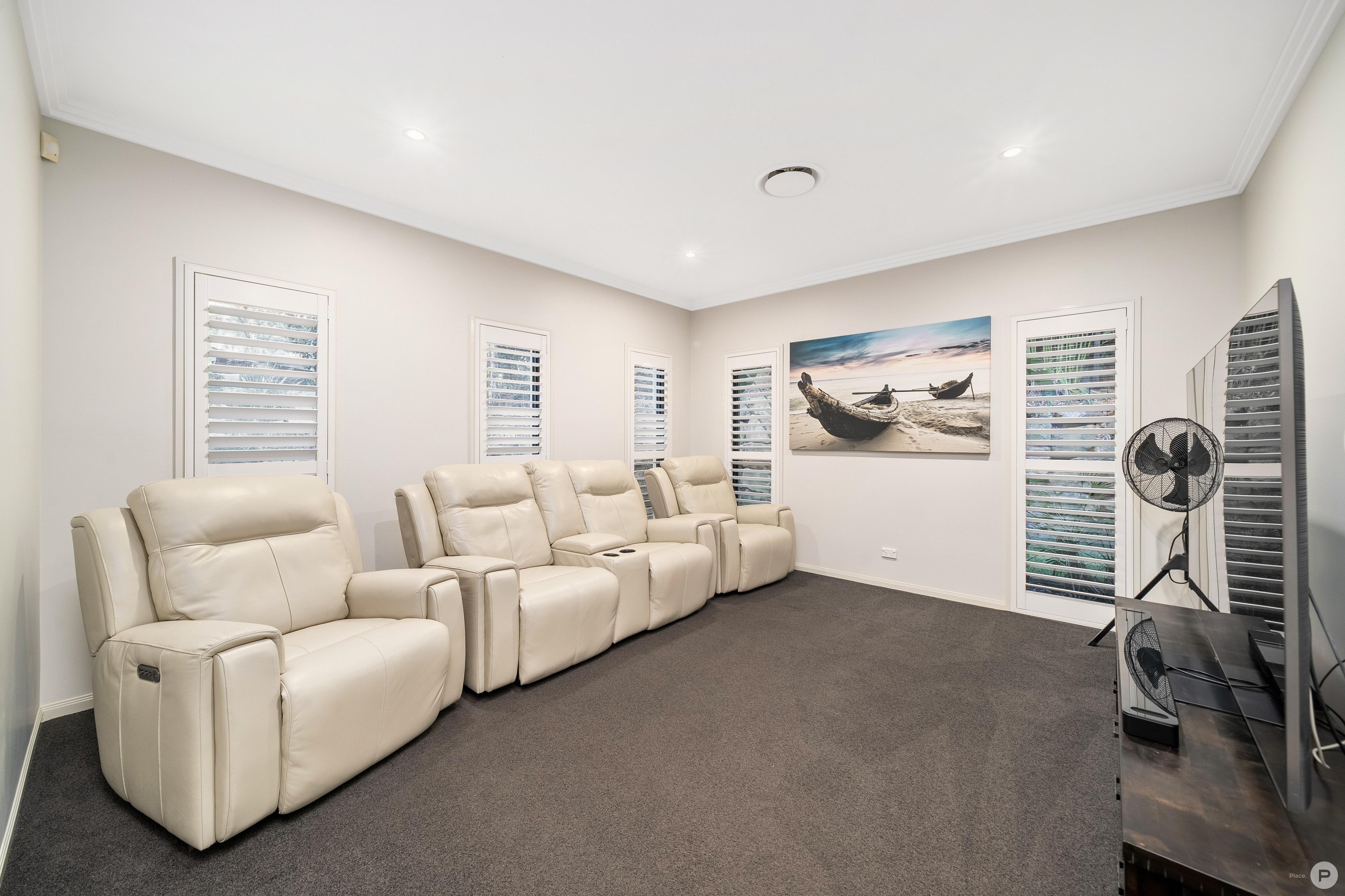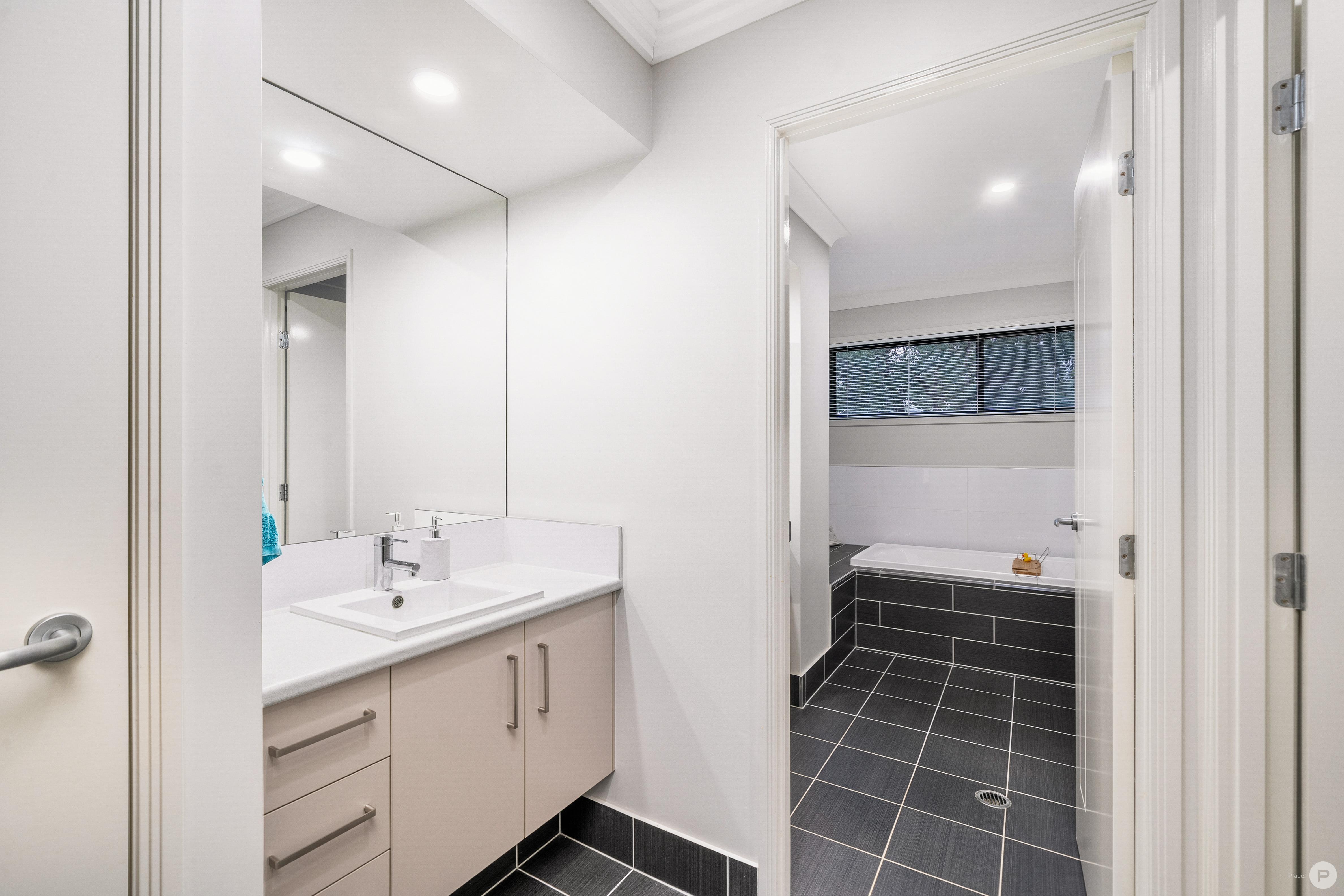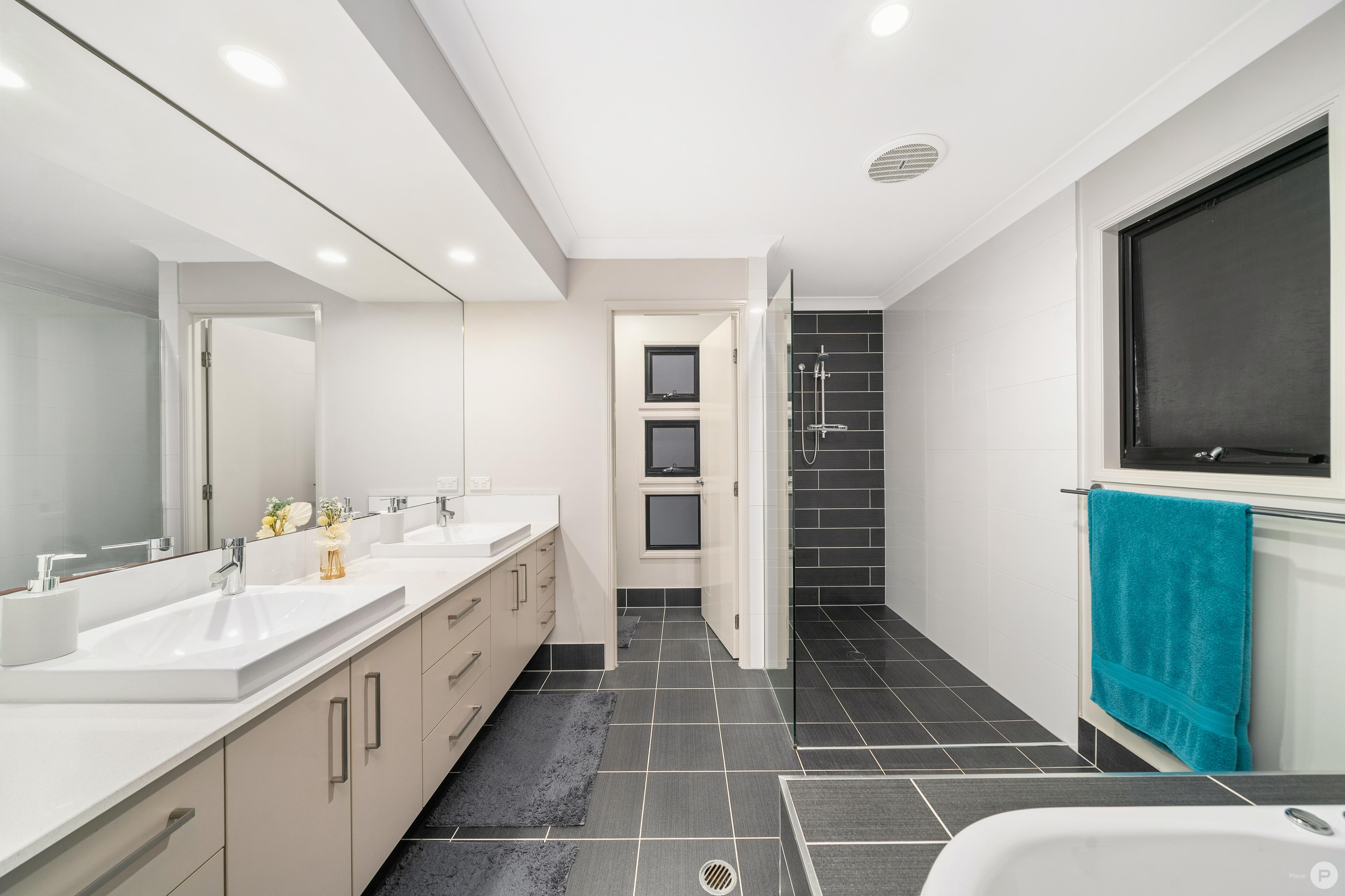 The upper level boasts a spacious family room with space for a study desk and TV area, and three generous sized bedrooms with built-in robes and ceiling fans in addition to the ducted zoned reverse-cycle air conditioning which guarantees comfortable living all year round. The main bathroom features a bath, large shower and vanity, and just outside you will find another vanity for guests and a separate toilet. The Master Retreat features a large his/hers walk-in robe, and an expansive ensuite featuring dual vanities, a frameless shower, separate toilet and luxurious spa bath.