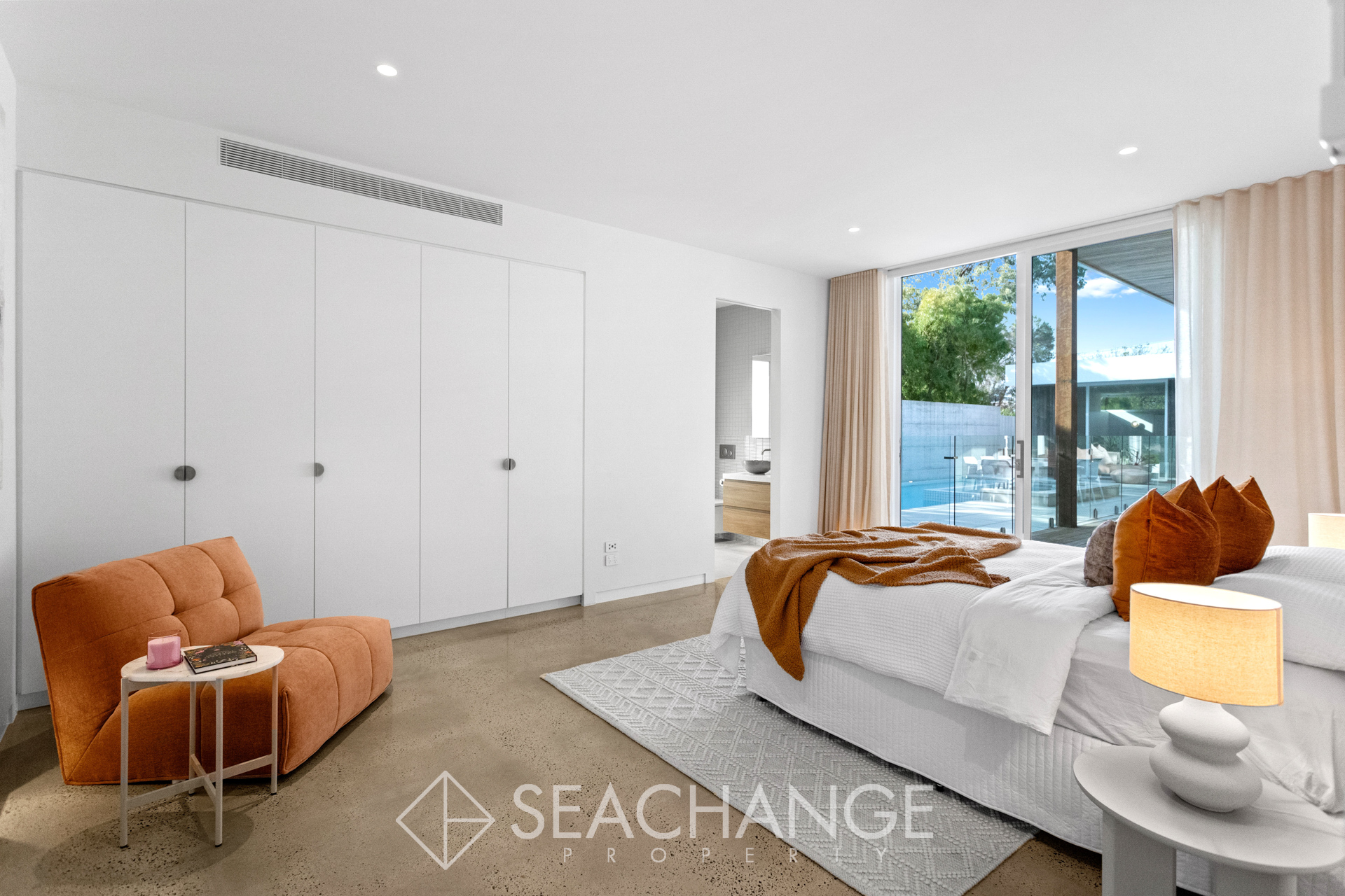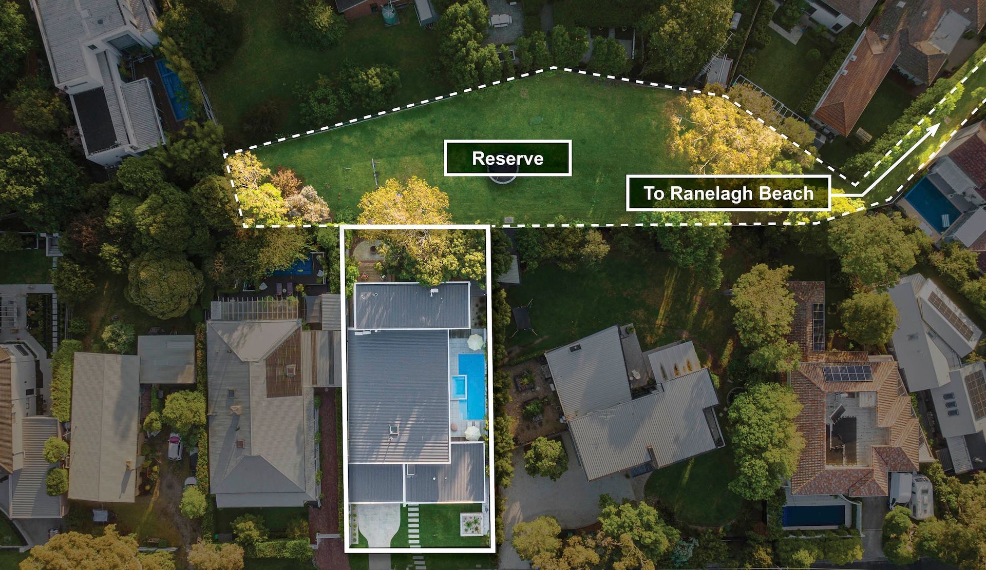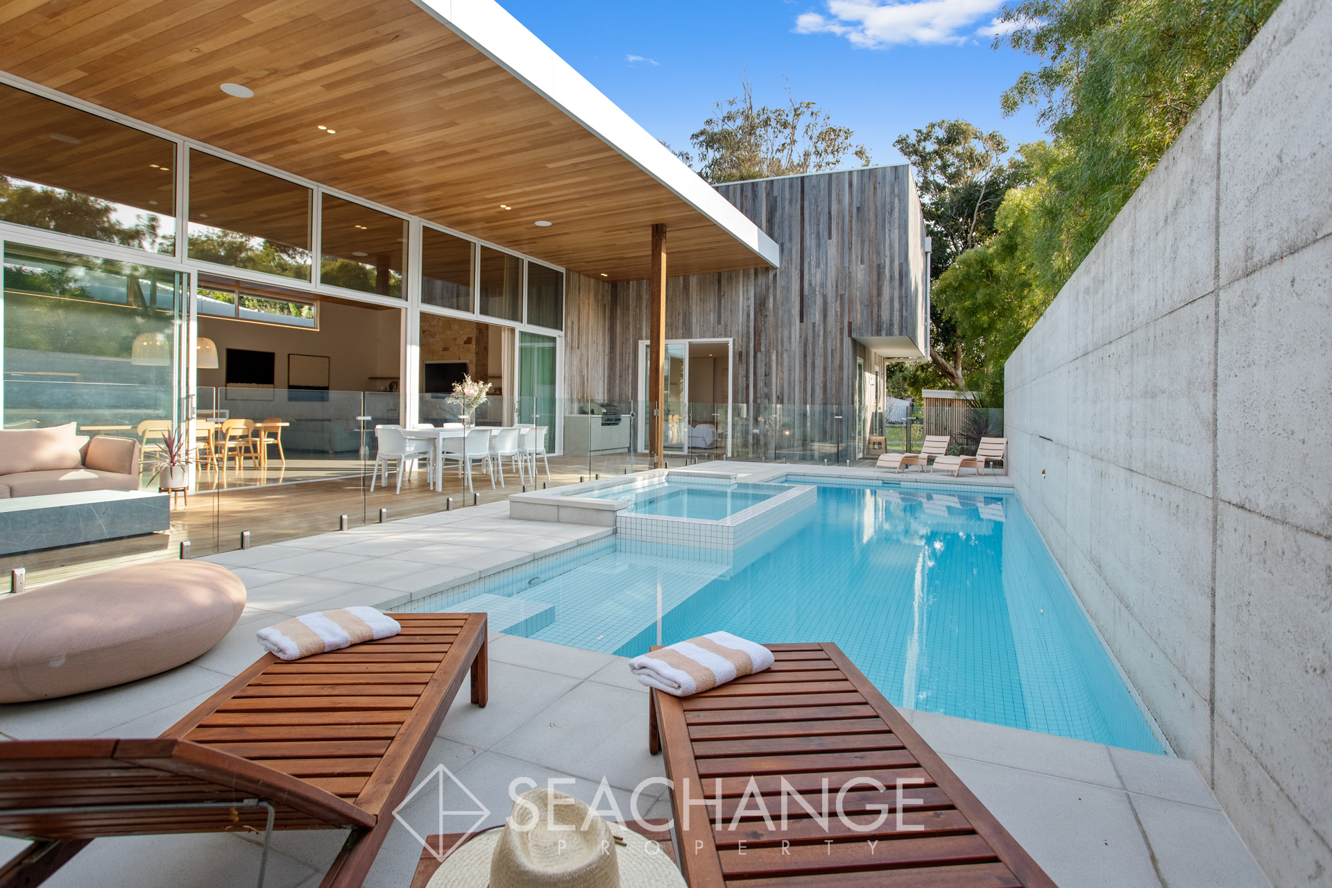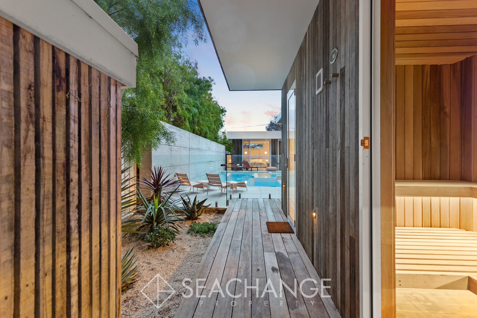 Architecturally designed for privacy, the master bedroom continues with sumptuous proportions through the walk-in wardrobe and ensuite bathroom. A harmony of Artedomus tiles brings together a Victoria & Albert bathtub, double shower, Brodware taps and bespoke Robert Gordan ceramic basins. Upstairs three additional bedrooms include walk-in robes and individual R/C cassette systems. Considered for flexibility the pool house and lower level living space allow the floorplan to evolve with the demands of entertainment and accommodation. The floorplan concludes with a traditonal style sauna and small rear yard space opening to the private neighbourhood reserve that leads through to Ranelagh Beach.