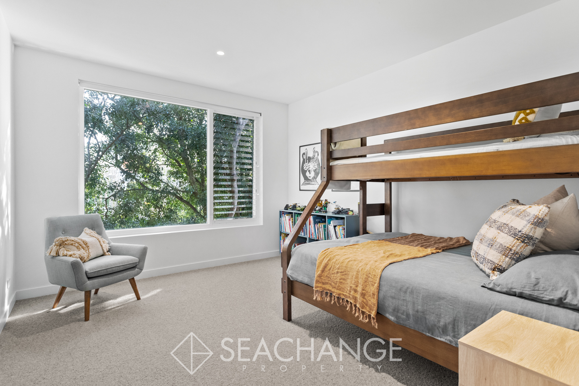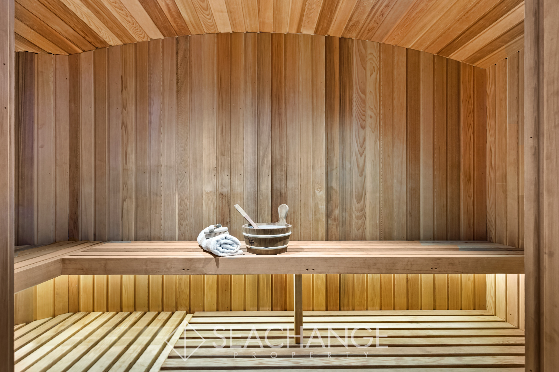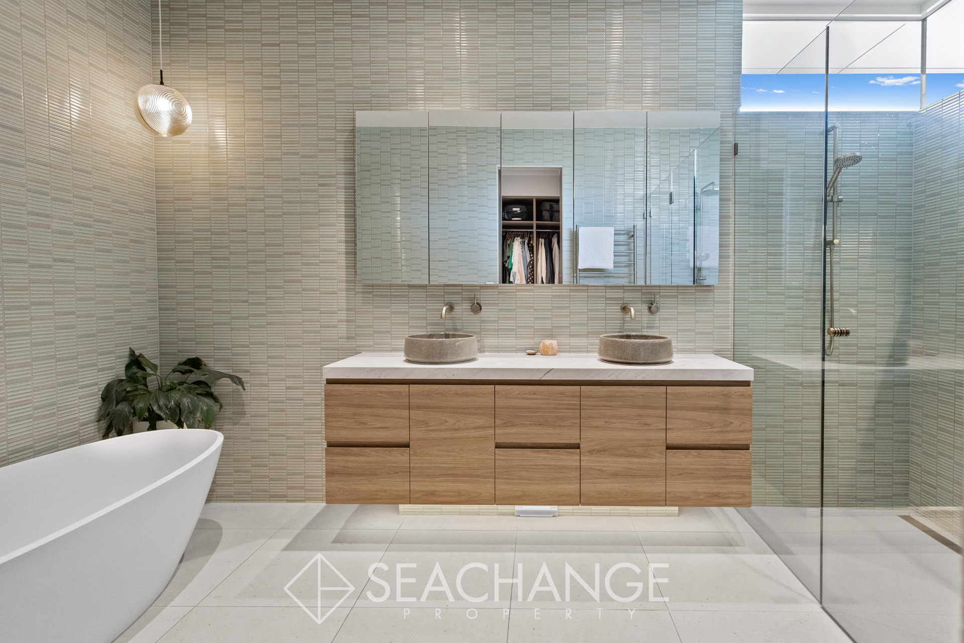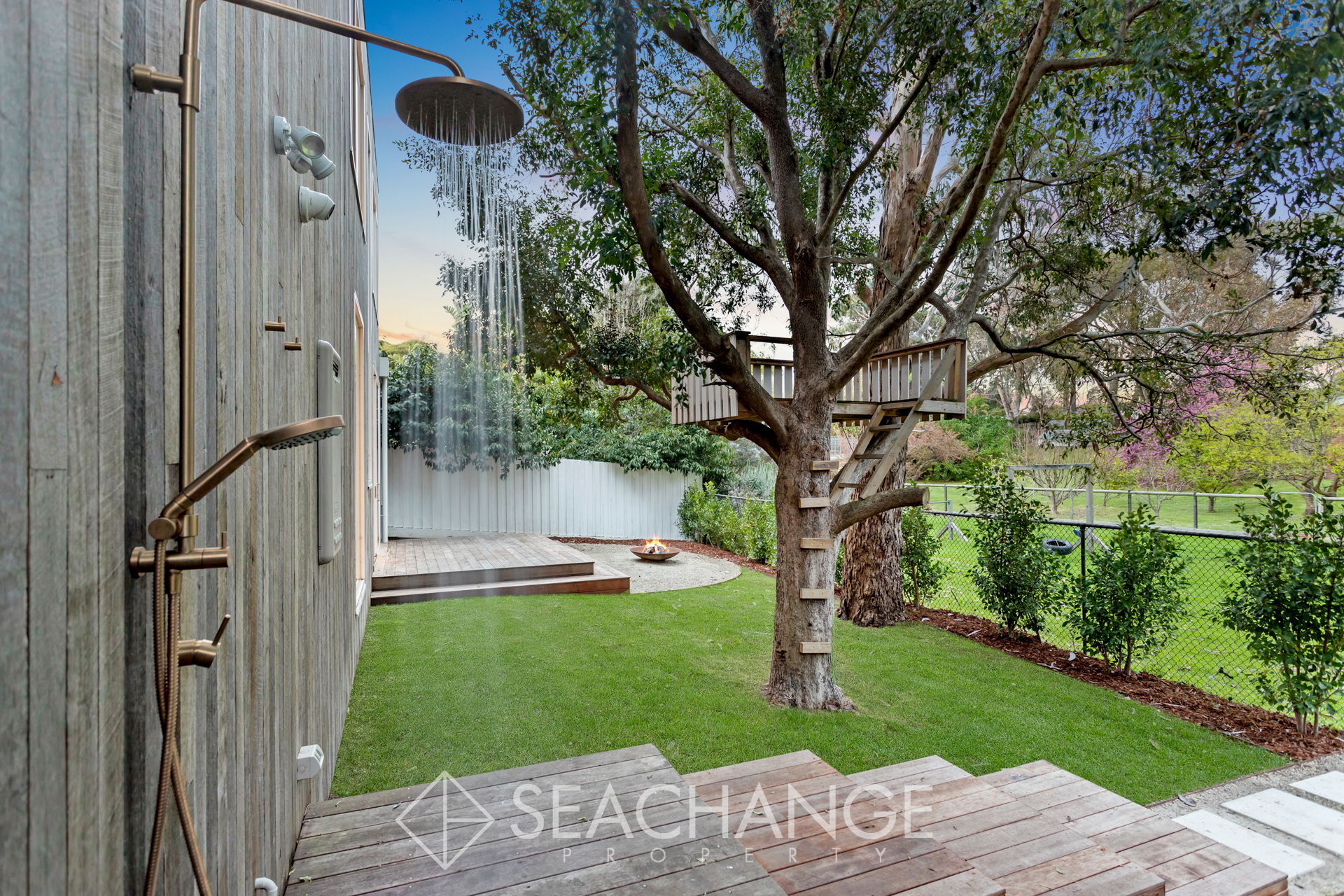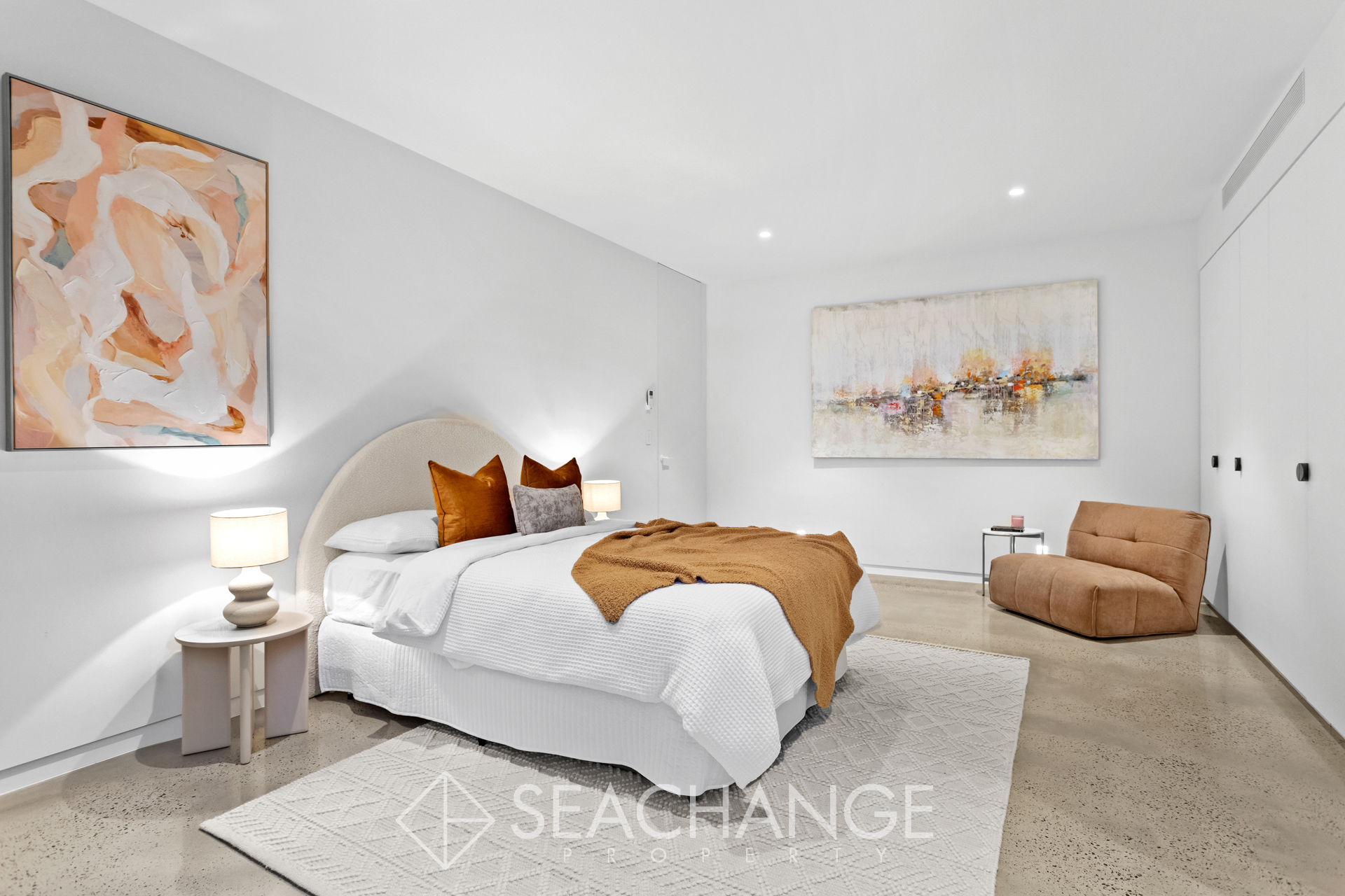 Architecturally designed for privacy, the master bedroom continues with sumptuous proportions through the walk-in wardrobe and ensuite bathroom. A harmony of Artedomus tiles brings together a Victoria & Albert bathtub, double shower, Brodware taps and bespoke Robert Gordan ceramic basins. Upstairs three additional bedrooms include walk-in robes and individual R/C cassette systems. Considered for flexibility the pool house and lower level living space allow the floorplan to evolve with the demands of entertainment and accommodation. The floorplan concludes with a traditonal style sauna and small rear yard space opening to the private neighbourhood reserve that leads through to Ranelagh Beach.