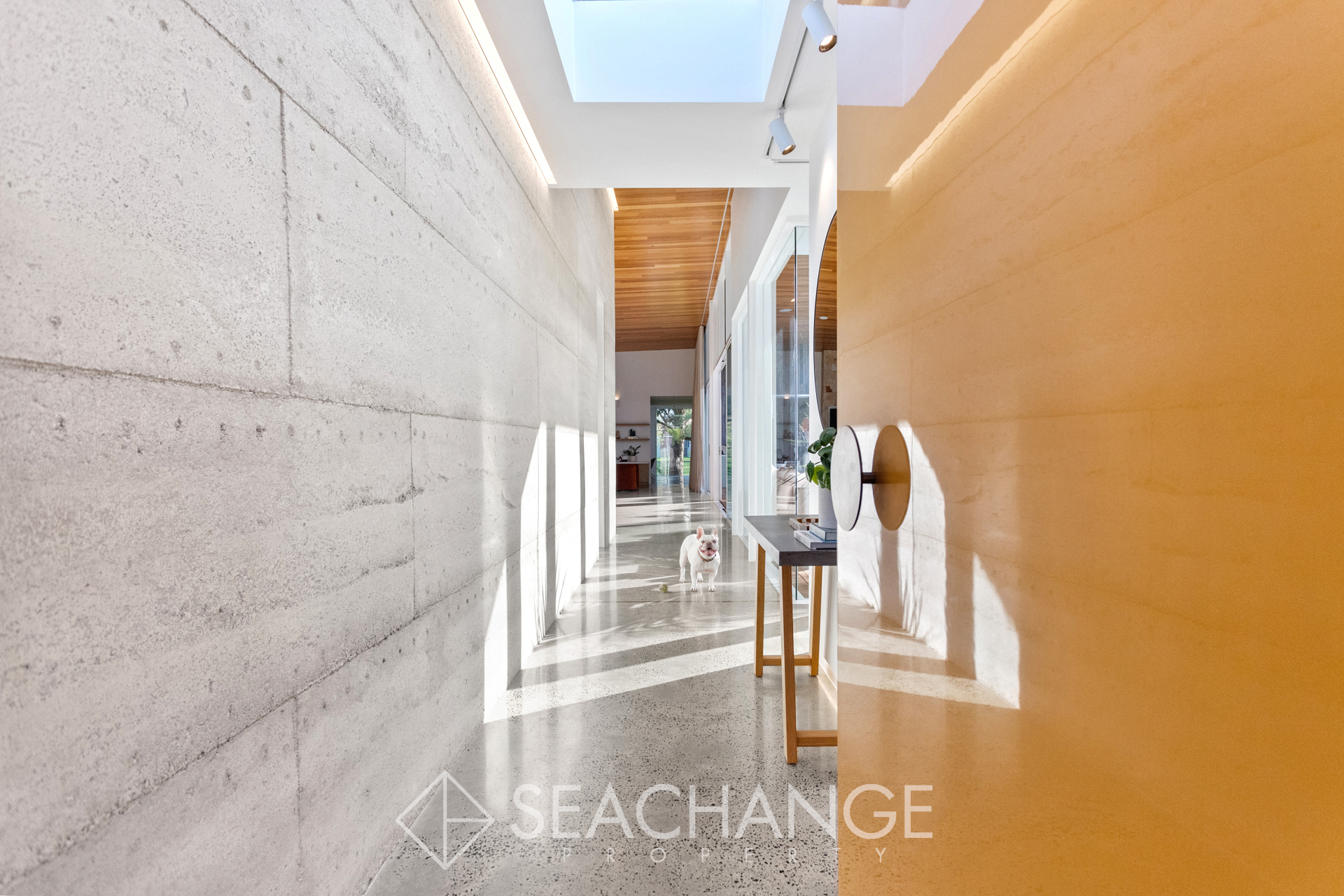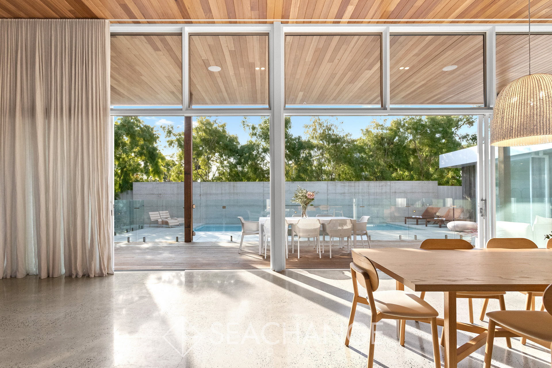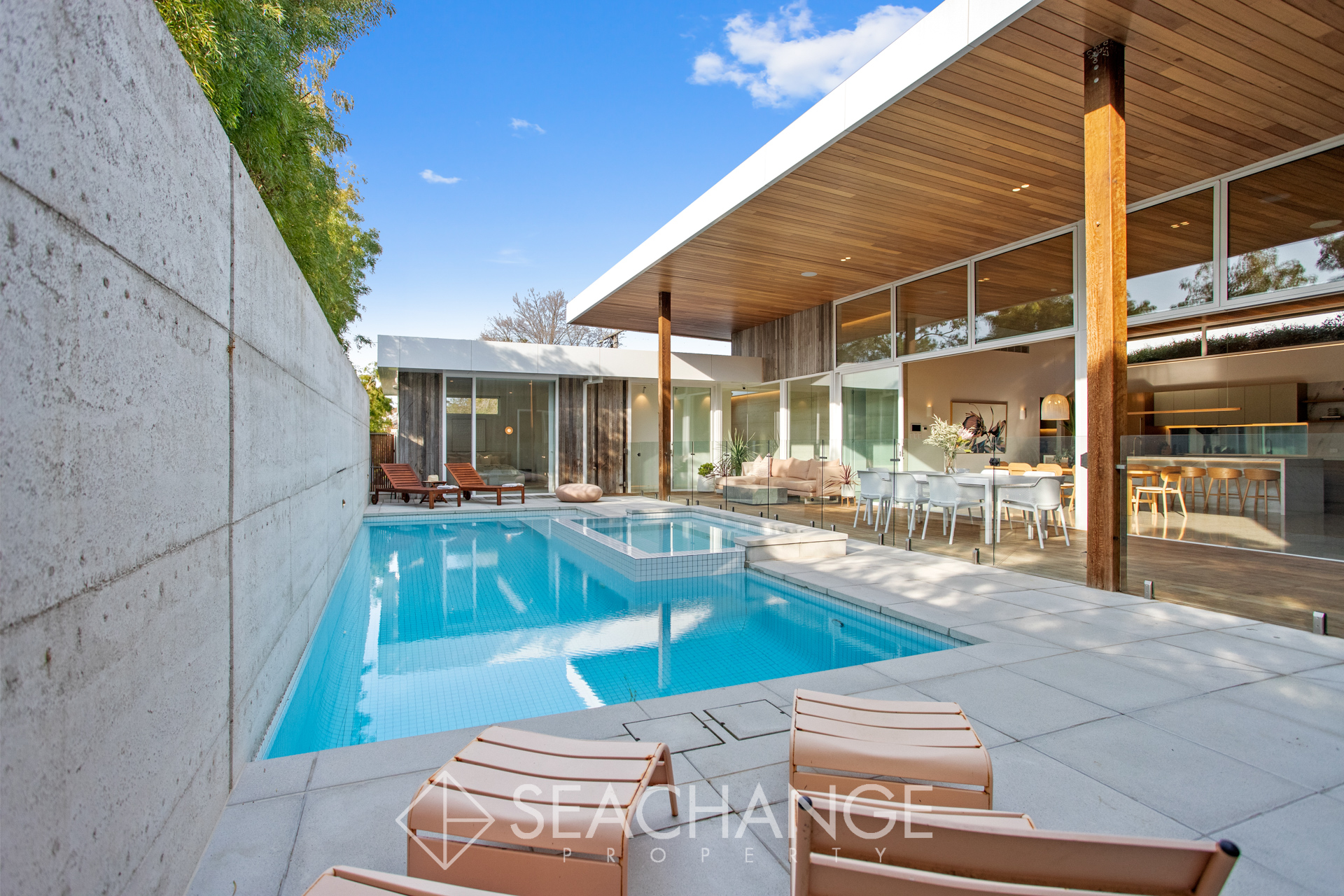 A triumph of craftsmanship and Vogue quality design, the residence expertly exceeds expectations of a humble street frontage. A trio of rammed earth walls, polished concrete flooring and floor-to-ceiling glazing unfolds beneath 4m high ceilings. Emulating the seduction of a Mid-century Palm Springs design, the home is anchored by a central poolside alfresco that frames the pool with a waterfall feature and integrated spa that melt into the background of a striking interior design.
