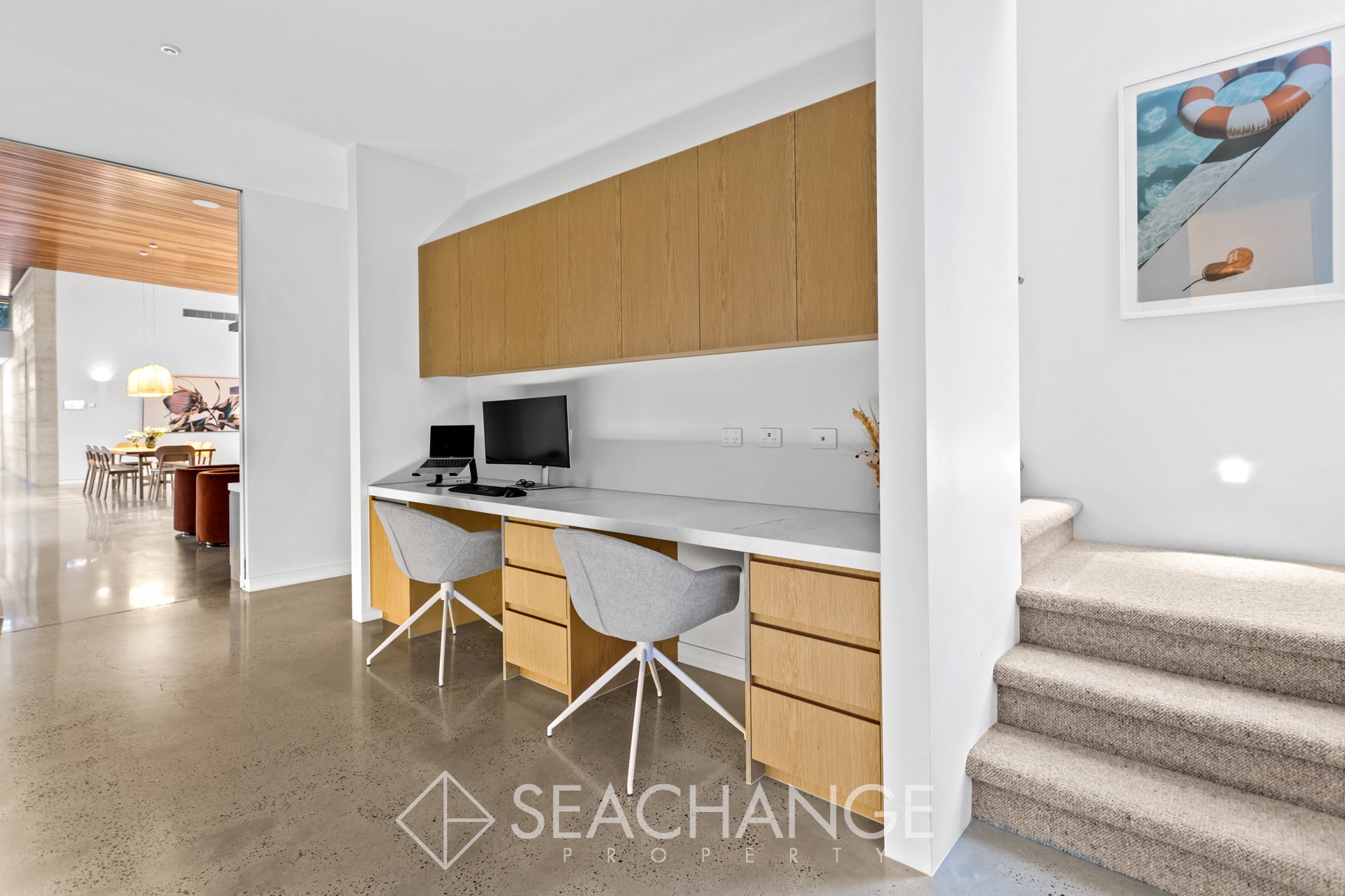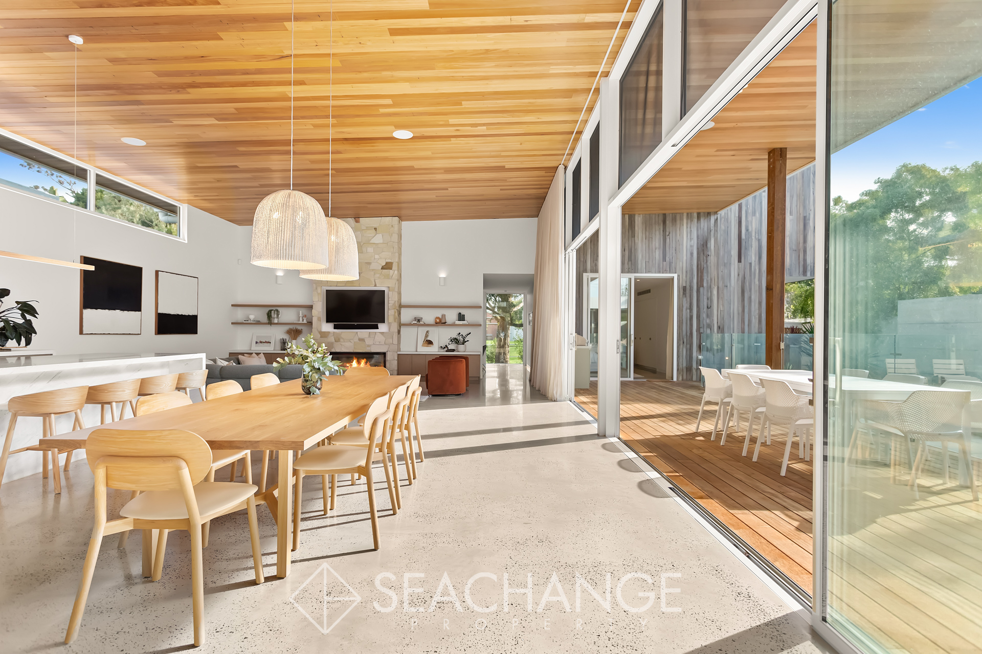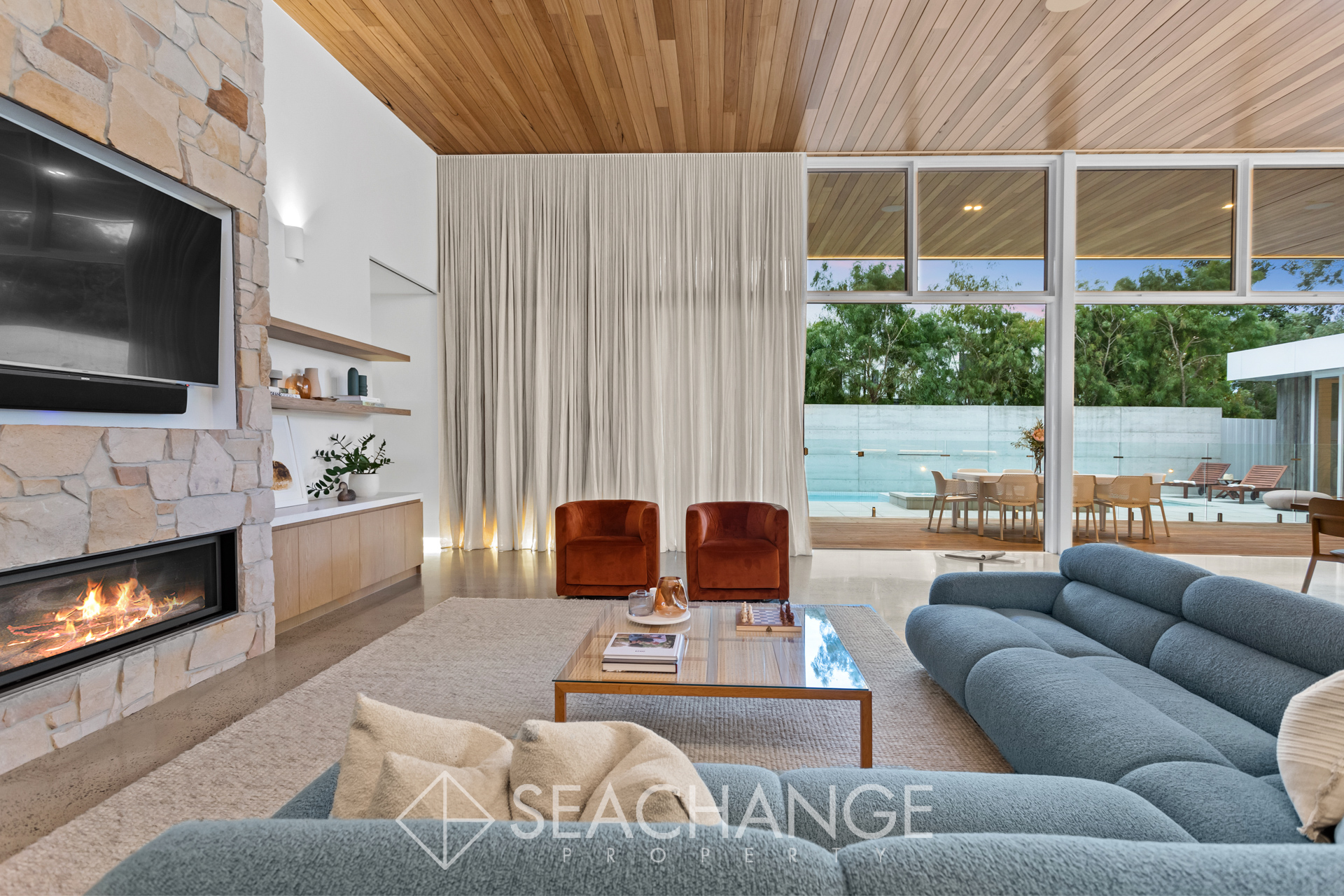 A triumph of craftsmanship and Vogue quality design, the residence expertly exceeds expectations of a humble street frontage. A trio of rammed earth walls, polished concrete flooring and floor-to-ceiling glazing unfolds beneath 4m high ceilings. Emulating the seduction of a Mid-century Palm Springs design, the home is anchored by a central poolside alfresco that frames the pool with a waterfall feature and integrated spa that melt into the background of a striking interior design.