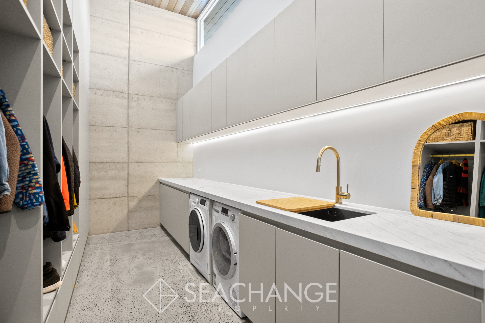 A trio of sub-zero fridges and the full suite of WOLF appliances enhance the kitchens design where a waterfall stone benchtop embraces the finest quality appliances. Delicately balancing functionality with master craftsmanship, the butlers pantry and laundry adjoin the home to the garage.