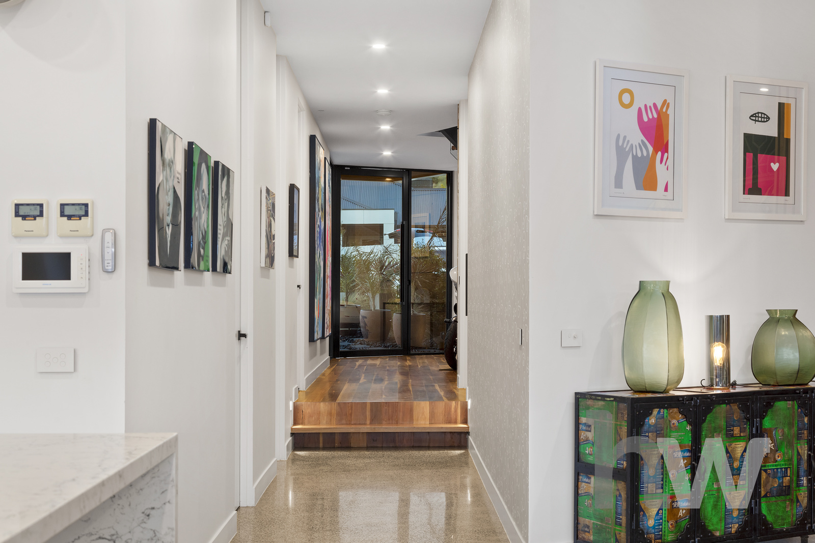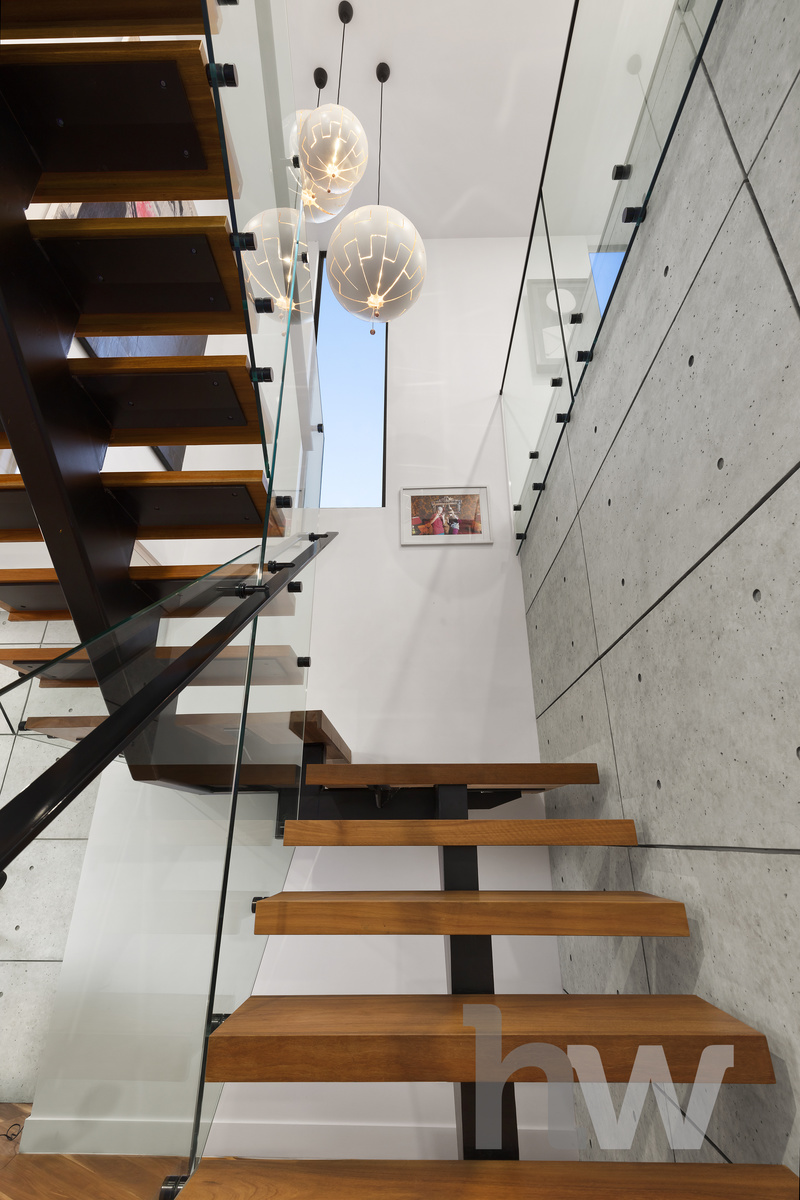 Stunning Entry and Layout Step into the grand commercial-grade glass foyer, featuring striking concrete walls and polished floorboards. The expansive design continues with a generous 3-car garage, complete with a dedicated workspace and direct access to the rear yard.