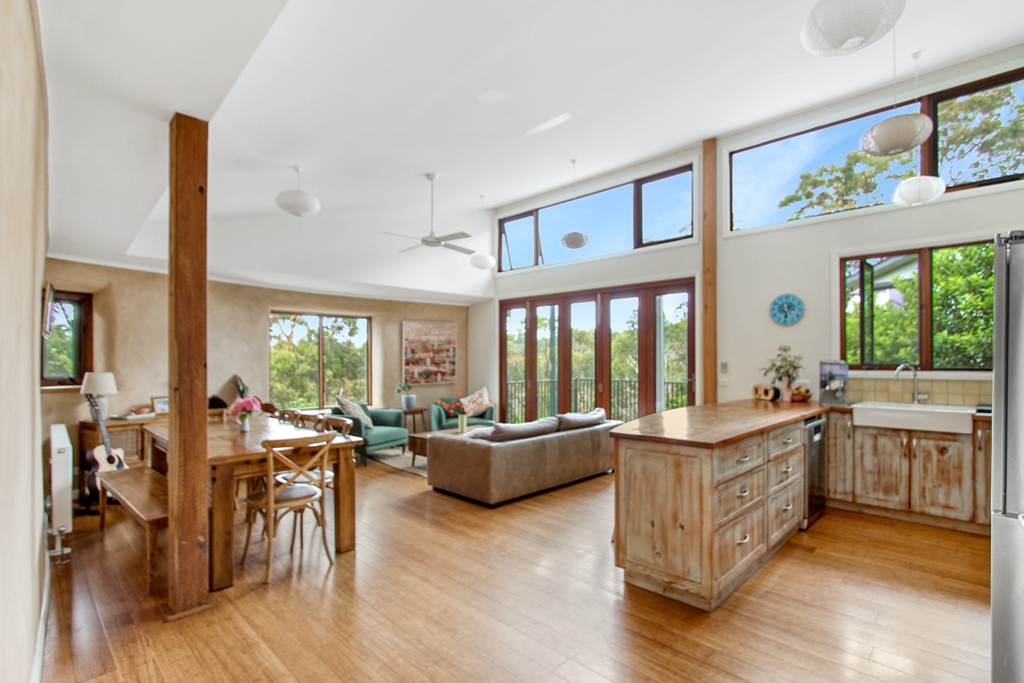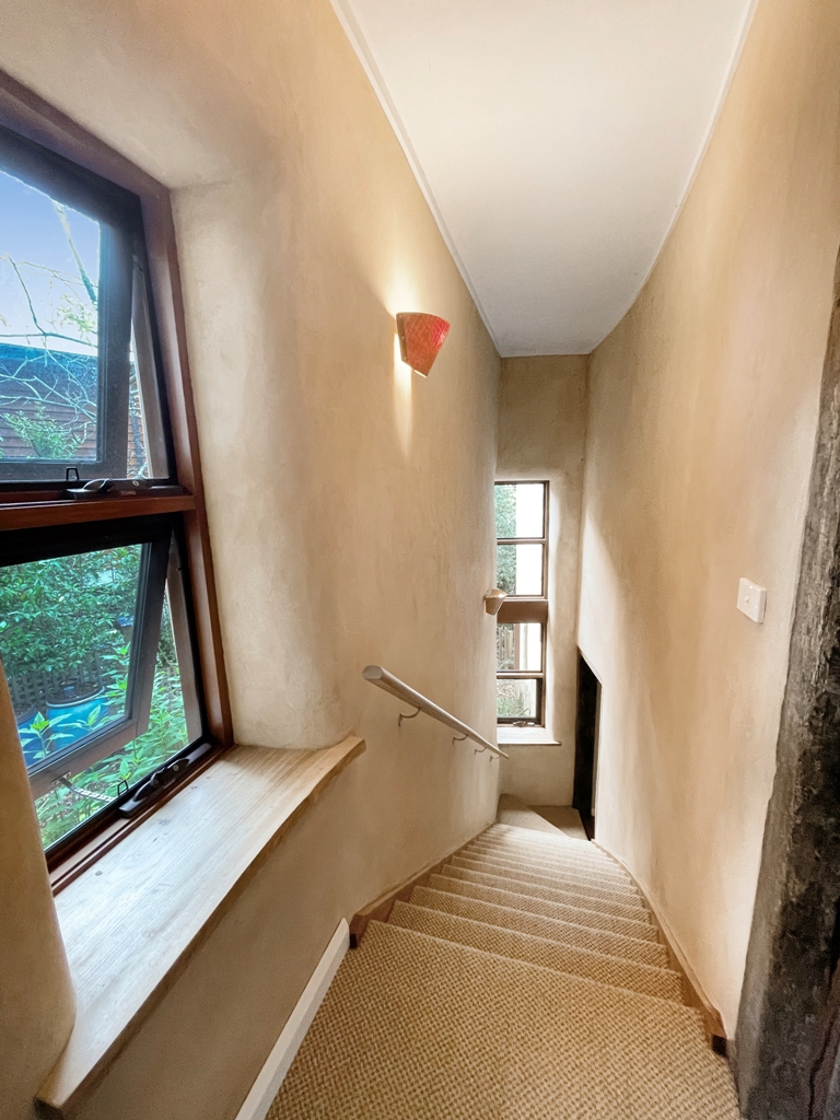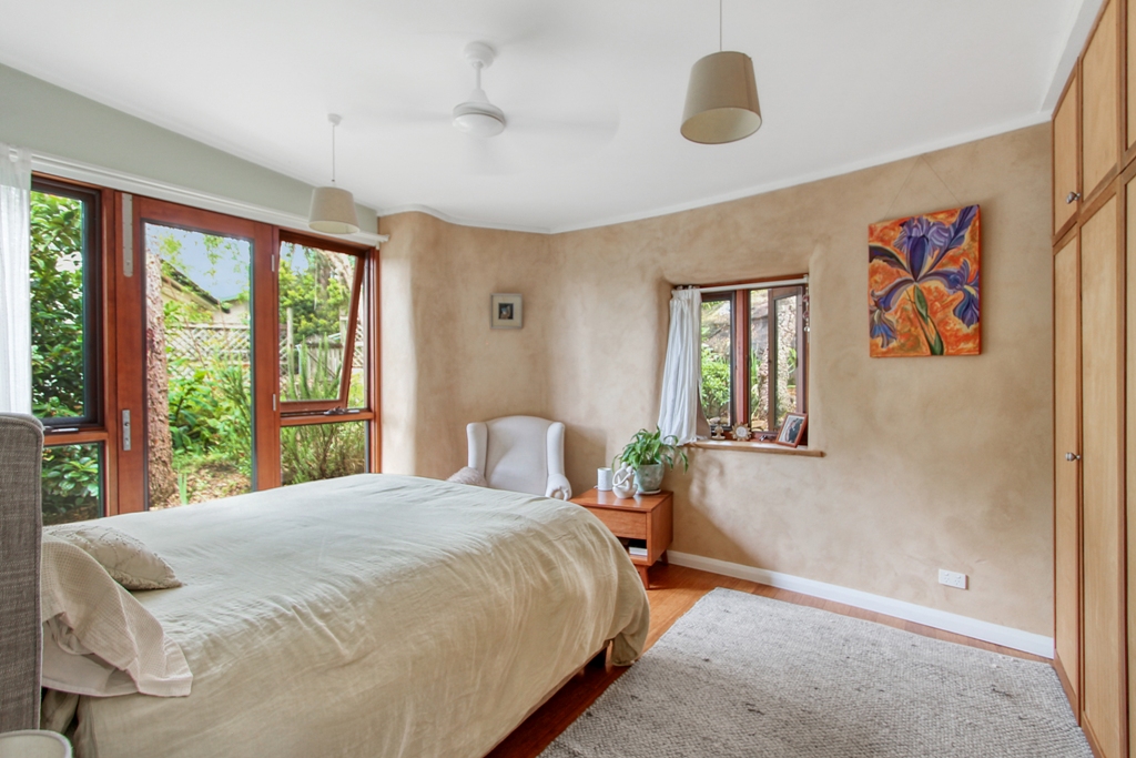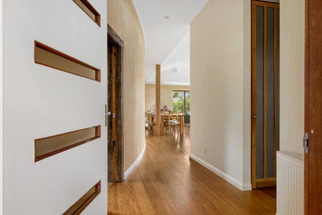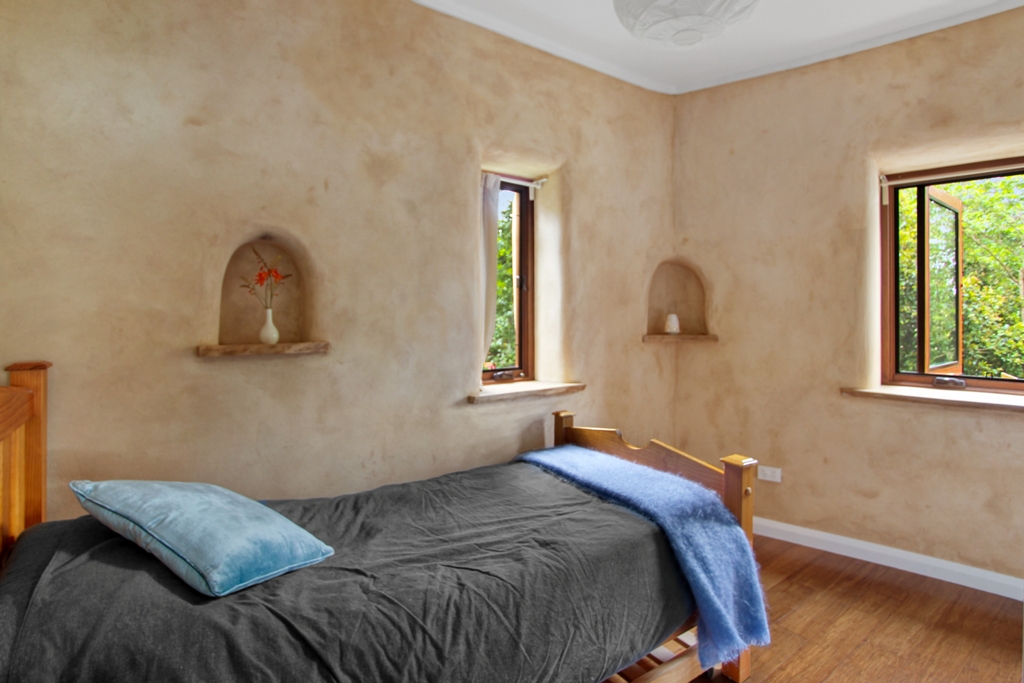 FEATURES Built to embrace the natural surroundings, this eco-architectural home incorporates mud and strawbale walls, hydronic heating, solar-passive layout, north-facing construction, double-glazed windows, reclaimed and considered choice of timbers and textiles, 900mm gas cooktop above dual ovens, 30,000L (collective) water tank capacity, and the separate studio for extended accommodation.
