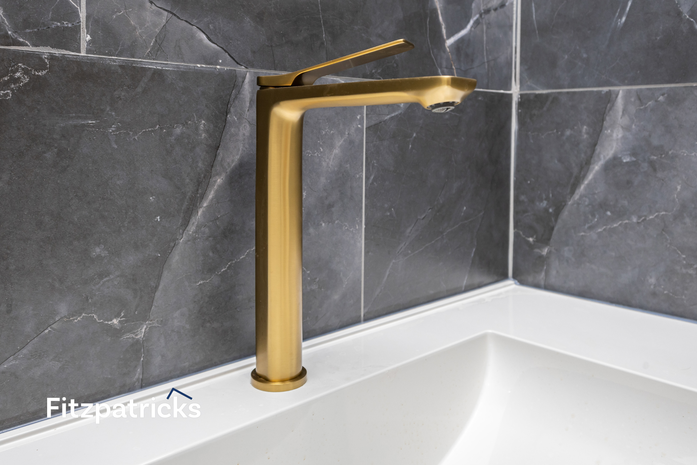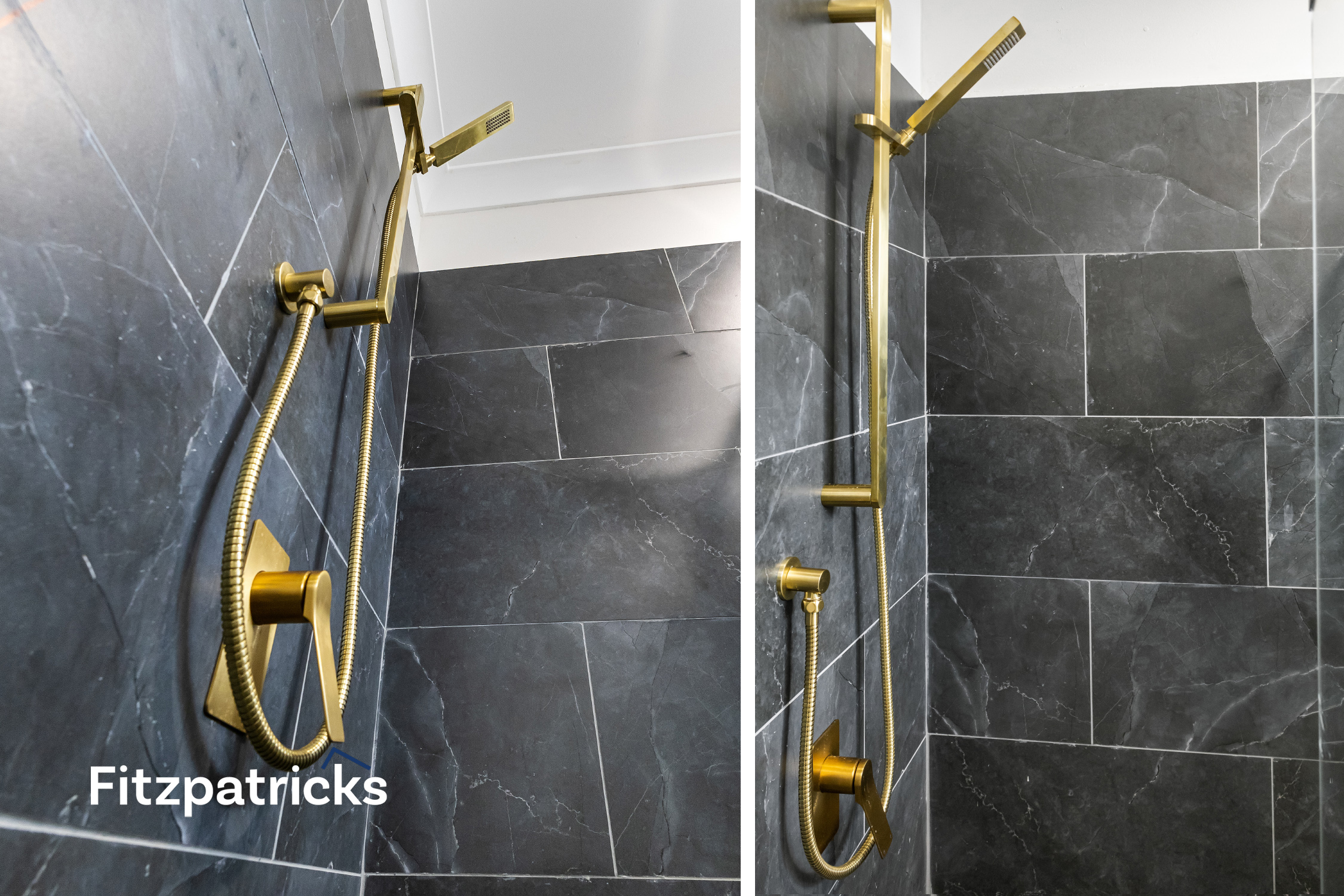dark slate-like tiles make a nice juxtaposition to the sophisticated brass shower head and mixers -